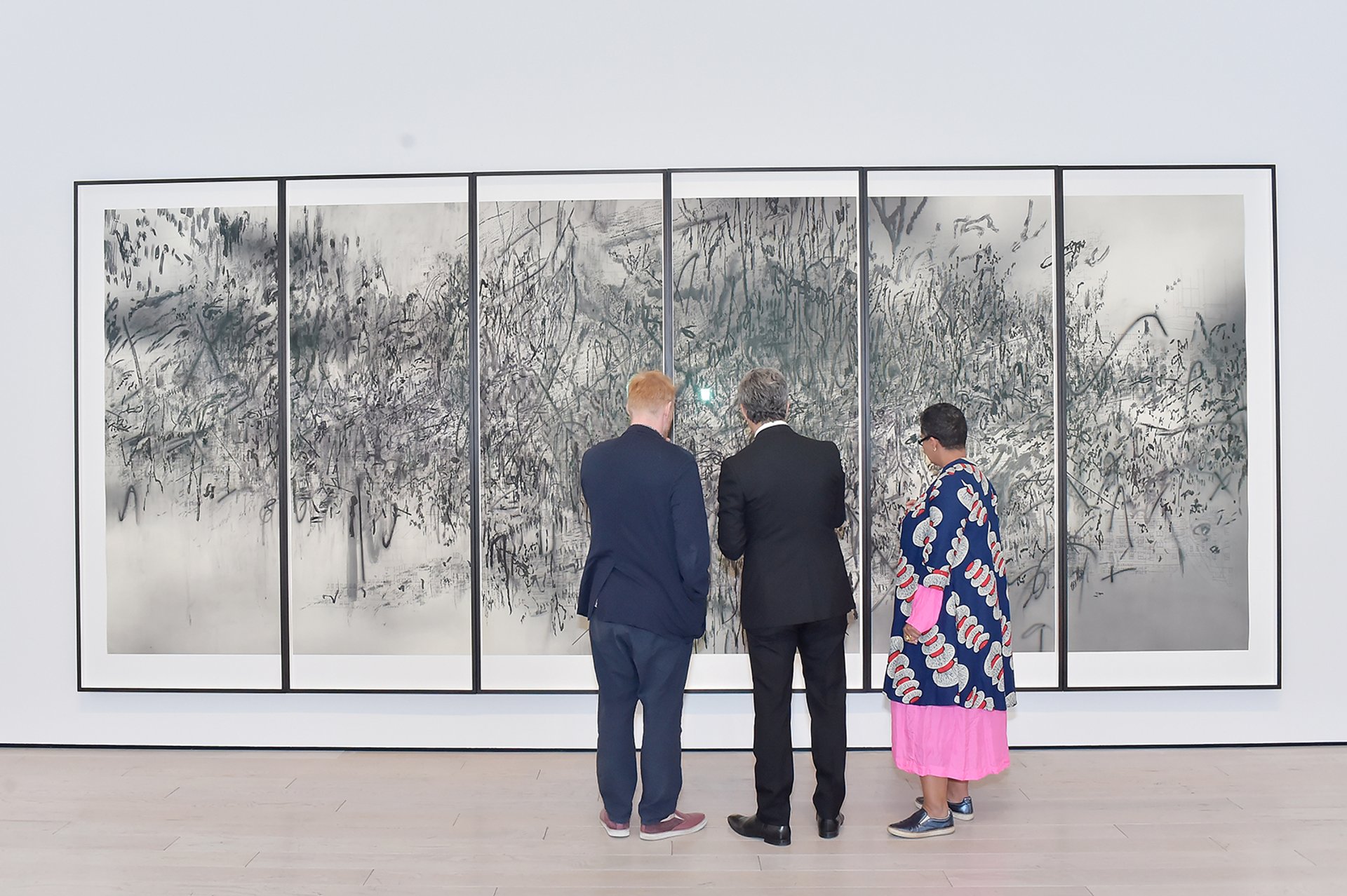 The artist Thomas Houseago, Lacma's director Michael Govan and the artist Muna El Fituri view Julie Mehretu's photogravure Photo: Stefanie Keenan/GettyImages for LACMA