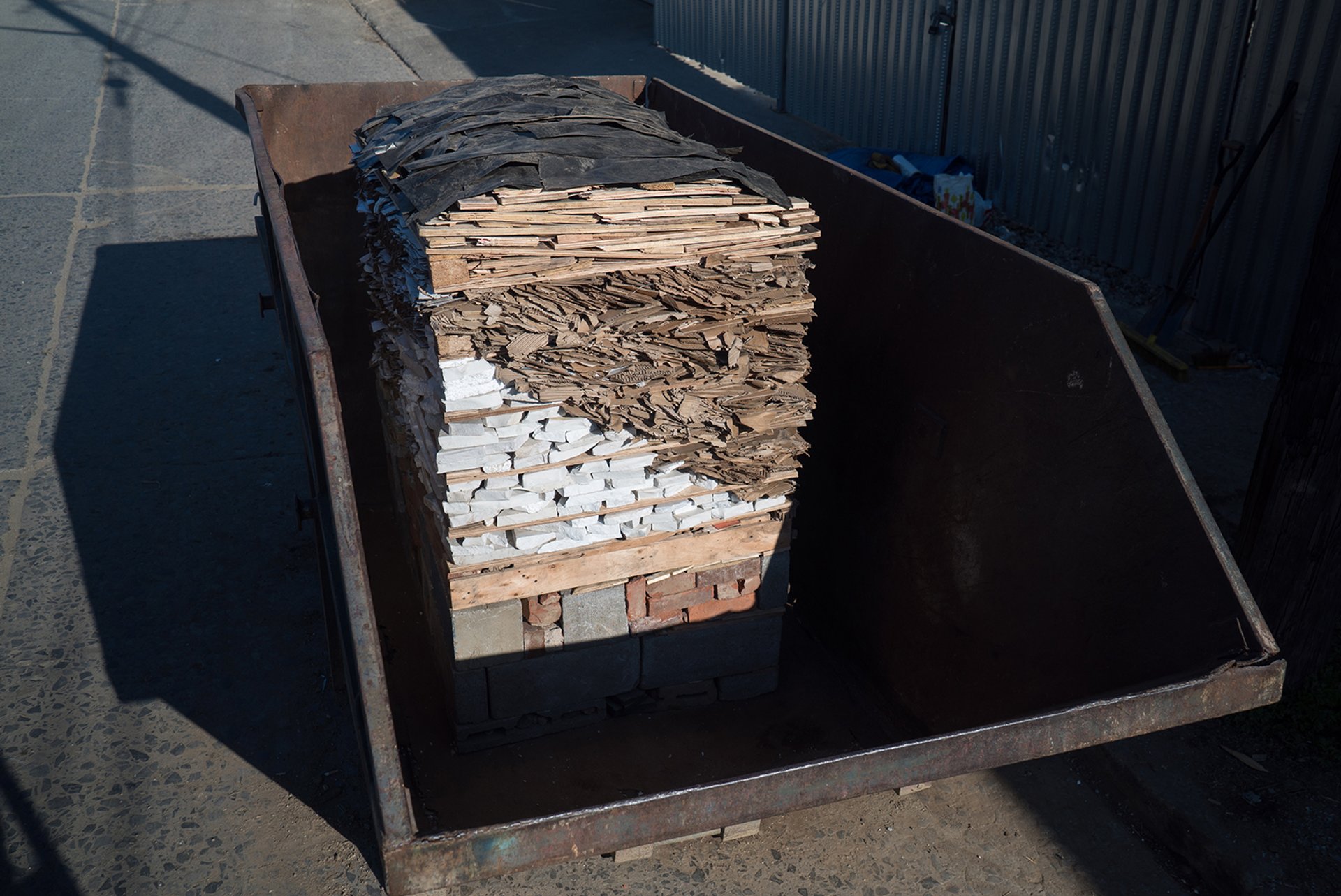 I eventually found Harman on a side street, standing next to the skip, assessing the cubic sculpture coming together inside. Built from the detritus found in the dumpster—bits of plywood, surprisingly lovely slabs of marble and so much cardboard—the unfinished piece looked as if it would fit next to any Arte Povera work or example of anarchitecture by the artist Gordon Matta-Clark. The rough diagonal line on the front of the work emerged as Harman began to assemble it and discovered that his spirit level was “useless” against the competing slants of the potholed street and the bent steel sides of the dumpster.