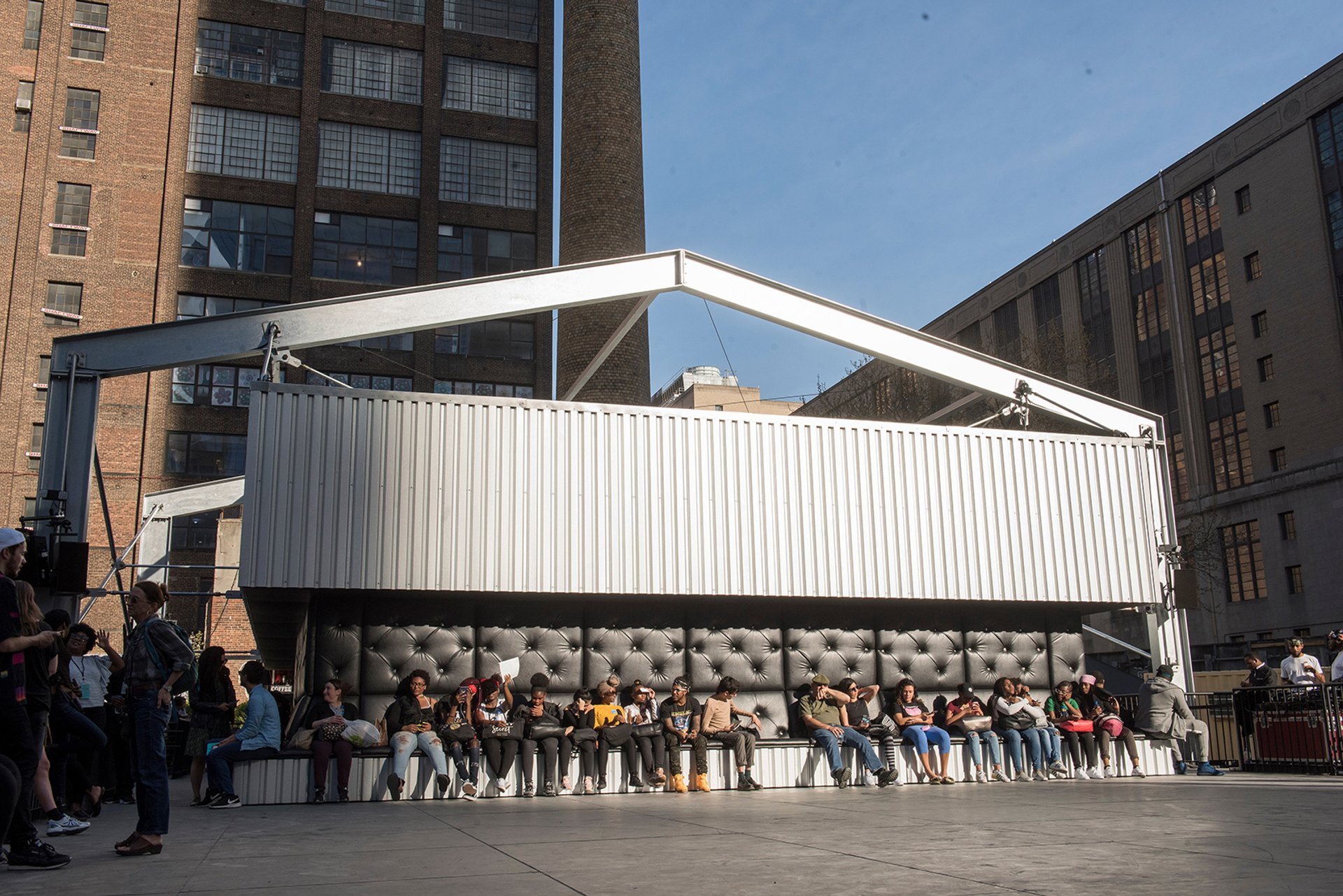 When I arrived for its 1 May afternoon premiere , the walls (to which comfy banquette seating is attached) were partly open to the street and Abra, the young, Atlanta-based R&B singer, was wailing away for an audience that included performers from Sehgal’s This Variation, the percussive choral work he introduced in 2012 for Documenta 13 and adapted—to captivating effect—for this situation.