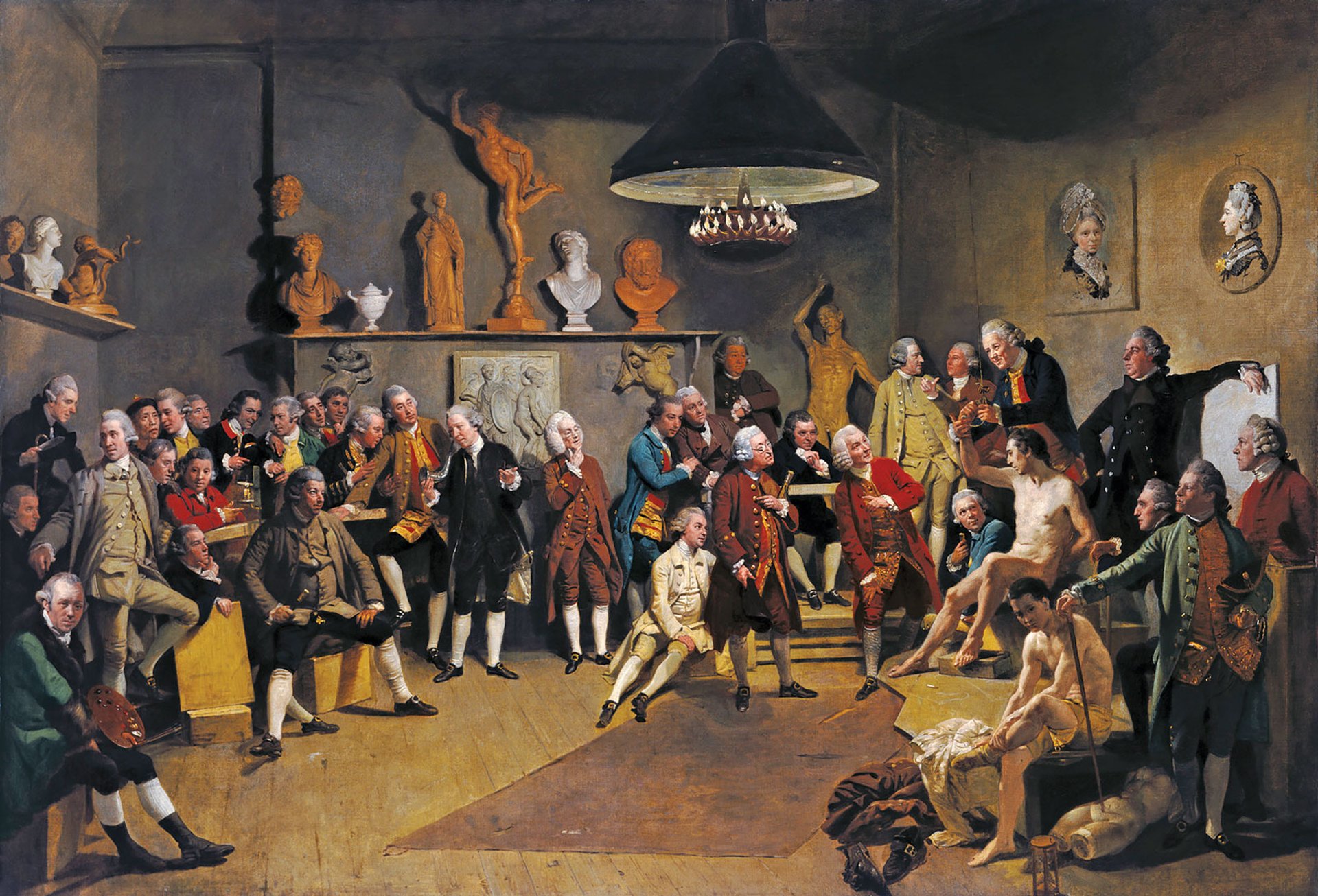 Zoffany’s painting depicts the RA’s 34 founders taking a life class, but the two female members are present only as portraits on the wall The Royal Collection, London