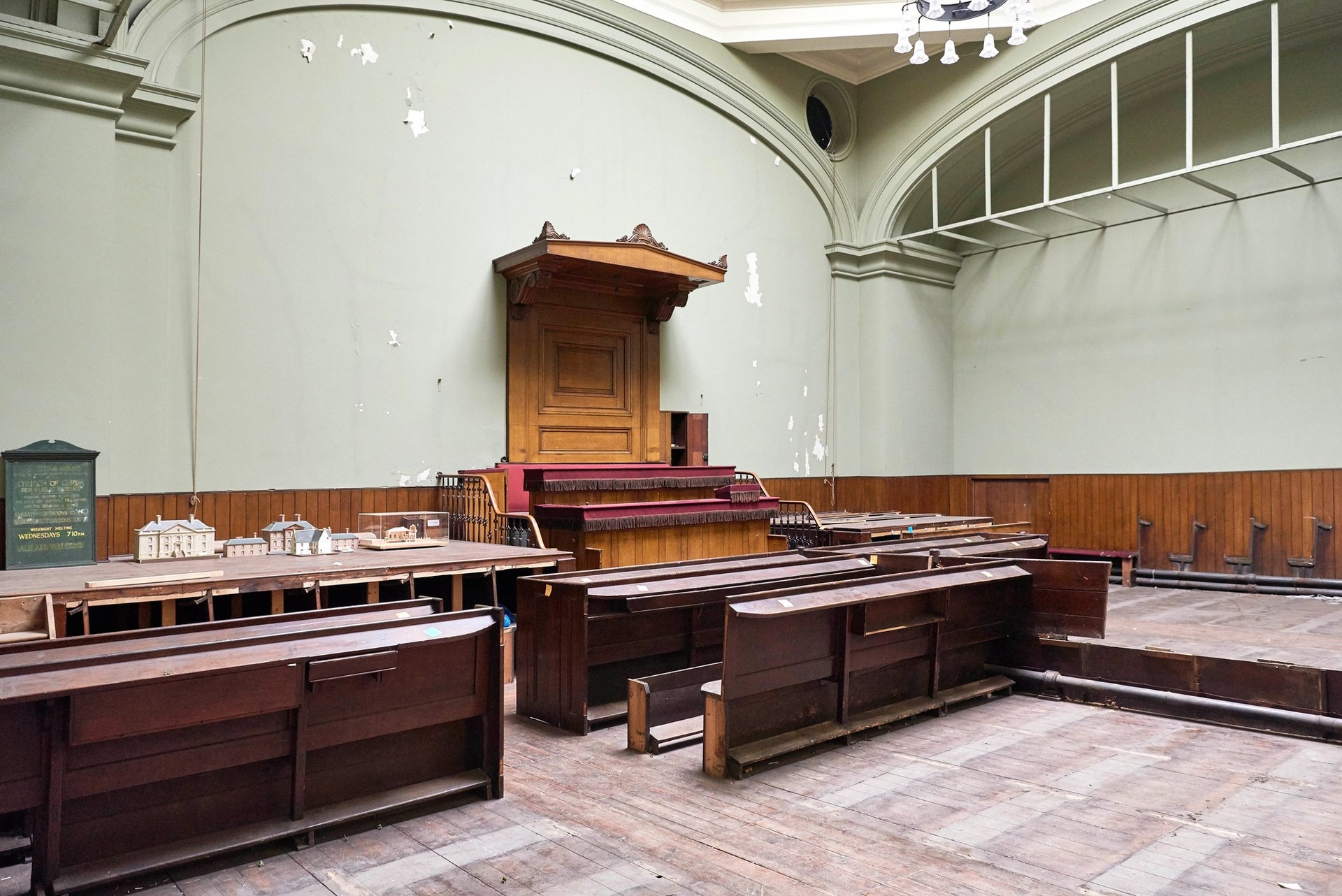 The floor was on a considerable slope and had to be levelled—it was a foot higher at the back so that, before the pulpit was installed, devotees at the back of the room could see the preachers—and the doors needed to be heightened.