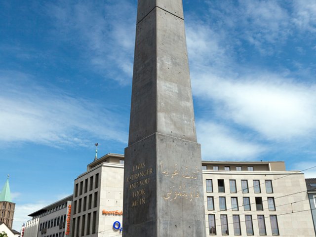 Oguibe says his Monument to Strangers and Refugees was specifically designed for Königsplatz (King’s Square), where it stood during Documenta, the contemporary art exhibition that takes place in Kassel every five years. This central square in Kassel is where Johann Wolfgang von Goethe was once refused a hotel room because he spoke French to the innkeeper. But city authorities have suggested giving it an alternative home on Holländische Platz, or Dutch Square, which is near the university and frequented by students and immigrants.