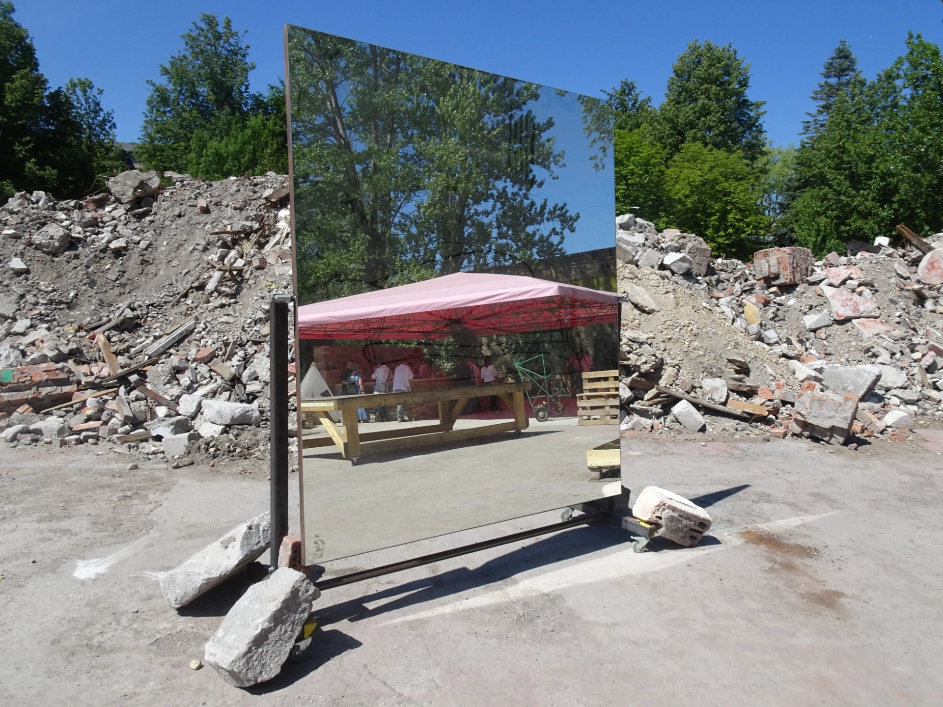 Vanden Eynde’s Cosmic Connection (2016) satellite dish welcomes visitors to the former Boļševička Factory, a venue previously used—like the biology faculty—by the Survival Kit contemporary art festival, run since 2009 by the Latvian Centre for Contemporary Art. The Brick Bar installed here in a landscaped “garden” of concrete and rubble aims to become the biennial's social nerve-centre.