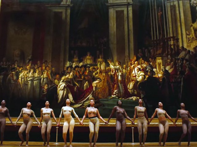 Beyoncé and Jay-Z took their love story to the Louvre Museum in the video for Apeshit, from their surprise joint album Everything Is Love, dropped over the weekend in the middle of their On the Run II tour. The striking video injects Blackness into the white, European and colonial space of the Parisian museum. Some of the Louvre’s most famous works make appearances, including Géricault’s The Raft of the Medusa (1818-19), The Winged Victory of Samothrace (190 B.C.), Veronese’s The Wedding at Cana (1563) and Ary Scheffer’s Francesca da Rimini and Paolo Malatesta Appraised by Dante and Virgil (1835), zooming in on Francesca’s tears. Marie-Guillemine Benoist’s Portrait of a Negress (1800), one of the few black subjects in the museum’s presentation of European art, gets a close-up. Among the most memorable clips is Beyoncé leading a lineup of black female dancers in front of David’s The Consecration of the Emperor Napoleon and the Coronation of Empress Joséphine on December 2, 1804 (1805-07). The video also recalls a viral 2014 Instagram post of the pair in front of the Mona Lisa, in which Beyoncé mimics the sitter’s enigmatic smile. The couple turns towards the painting at the end of Apeshit—do they have their sights set on (or are they arriving at) that level of fame?