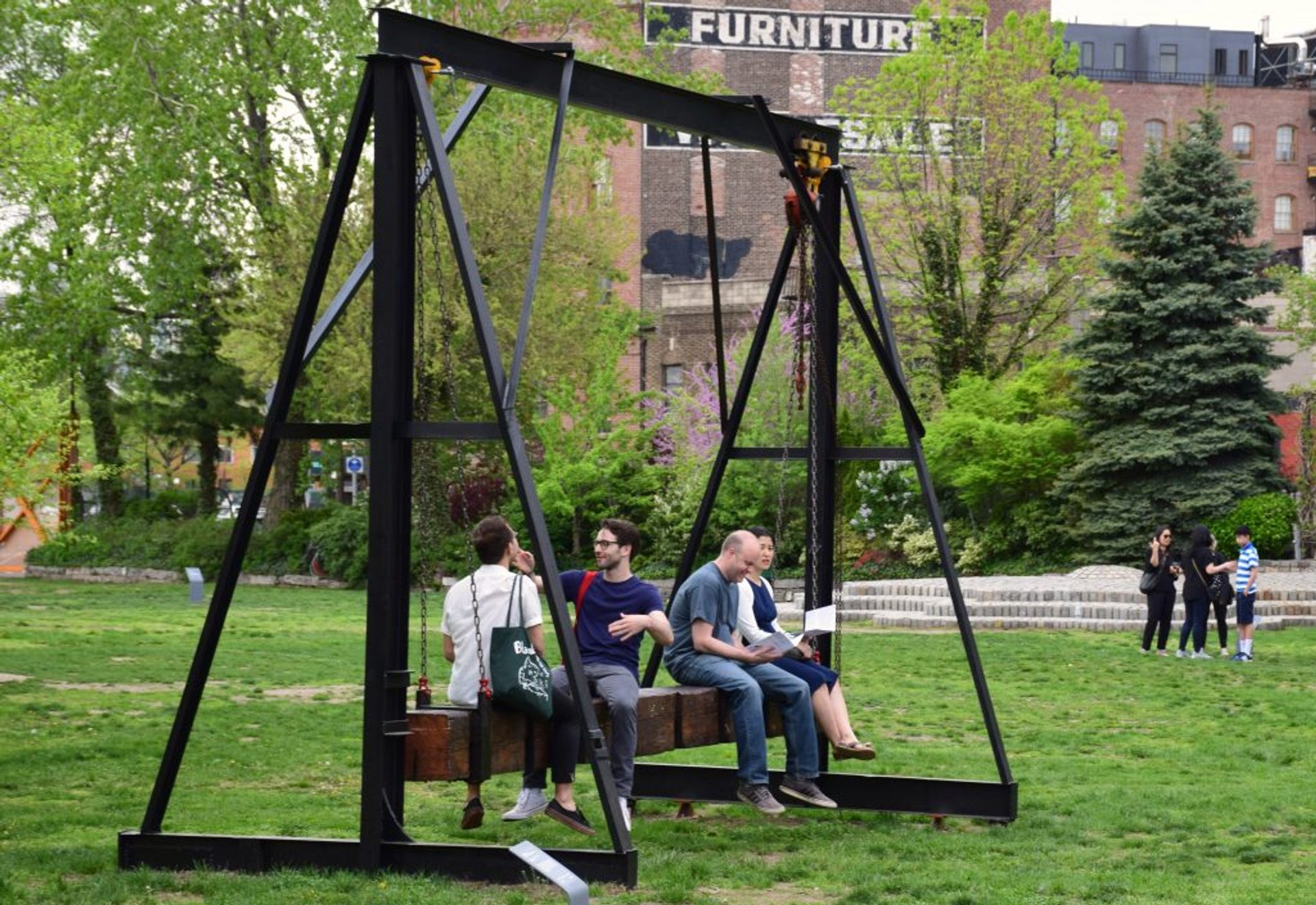 The Socrates Sculpture Park has a new fountain in the form of a pick-up truck. In Untitled (Late Bloomer) (2018), one of the artist Virginia Overton’s ten sculptures on view all summer, water fills and flows through the back of the transformed truck, while lotus blossoms float on the surface. And the massive Untitled (Suspended Beam) (2018), turns a reclaimed pine beam into a swing fit for a group.