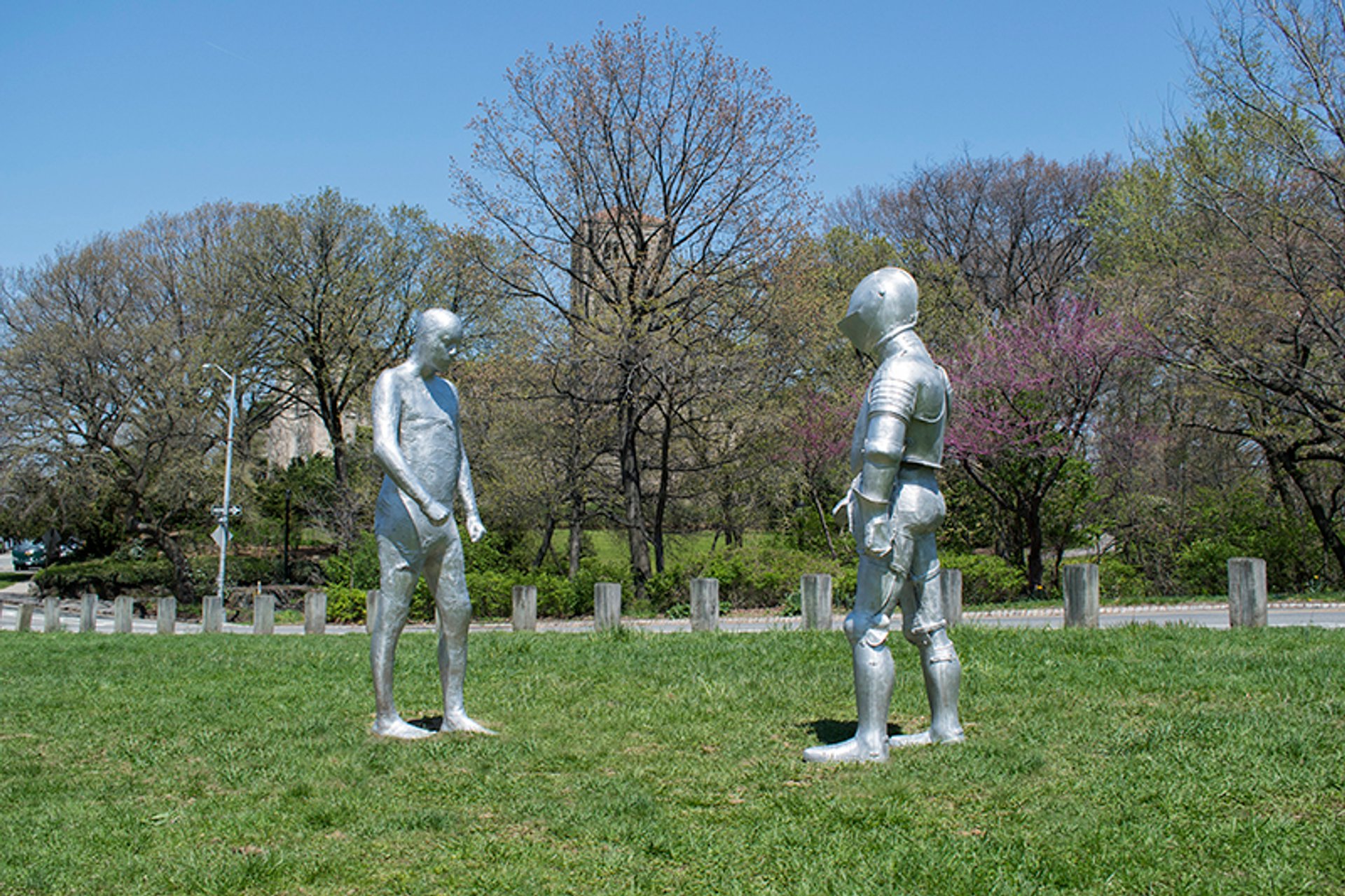 While the exhibition Heavenly Bodies takes up space inside the Metropolitan Museum of Art’s Upper Manhattan outpost for medieval art, a group of earthly bodies has landed at the Cloisters Lawn, in the Icelandic artist Steinunn Thorarinsdottir’s public work. The project places Thorarinsdottir’s typical nude, androgynous life-sized figures, based off the body of her son, face-to-face with replicas of 16th-century European suits of armour selected from the Met’s collection. They have been 3D scanned by the museum’s imaging department and cast in the same aluminium as the human figures. Unlike in a museum setting behind glass, where the armour’s original purpose is somewhat lost, the artist says, these “are actual firm, cast sculptures that people can approach, touch and feel the tension between the armour and the naked vulnerable human being opposite.”