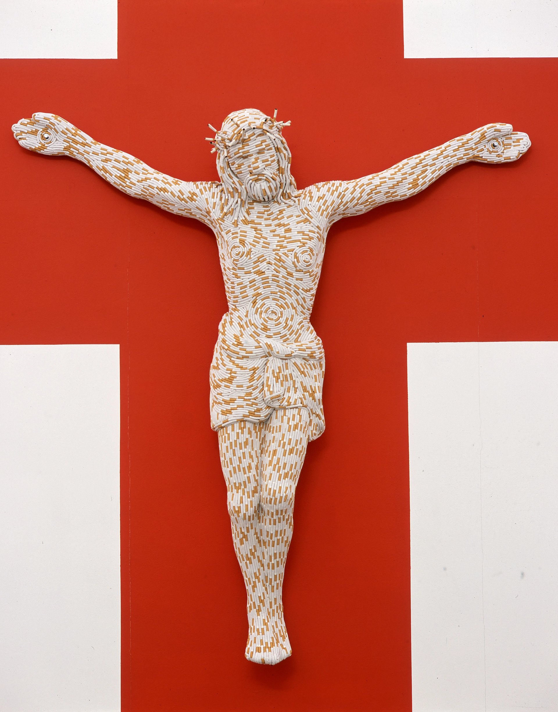 For all her scrappy, found-in-the-street materials—battered toilet bowls and furniture, old mattresses and mattress springs, rubber chickens, stuffed pantyhose, evocative foodstuffs, crushed cars—as a whole, the show conveys an unmistakable sense of majesty that I found almost breathtaking. That was especially true on the top floor, where, in a sendup of manliness, a giant self-portrait of a spread-legged Lucas oversees looming plaster phalluses and crushed, burned or sliced Jaguars and a crucifixion completely covered, end-to-end, with 50 cases worth of unsmoked cigarettes. “I like a hermaphroditic situation,” Lucas joked.
