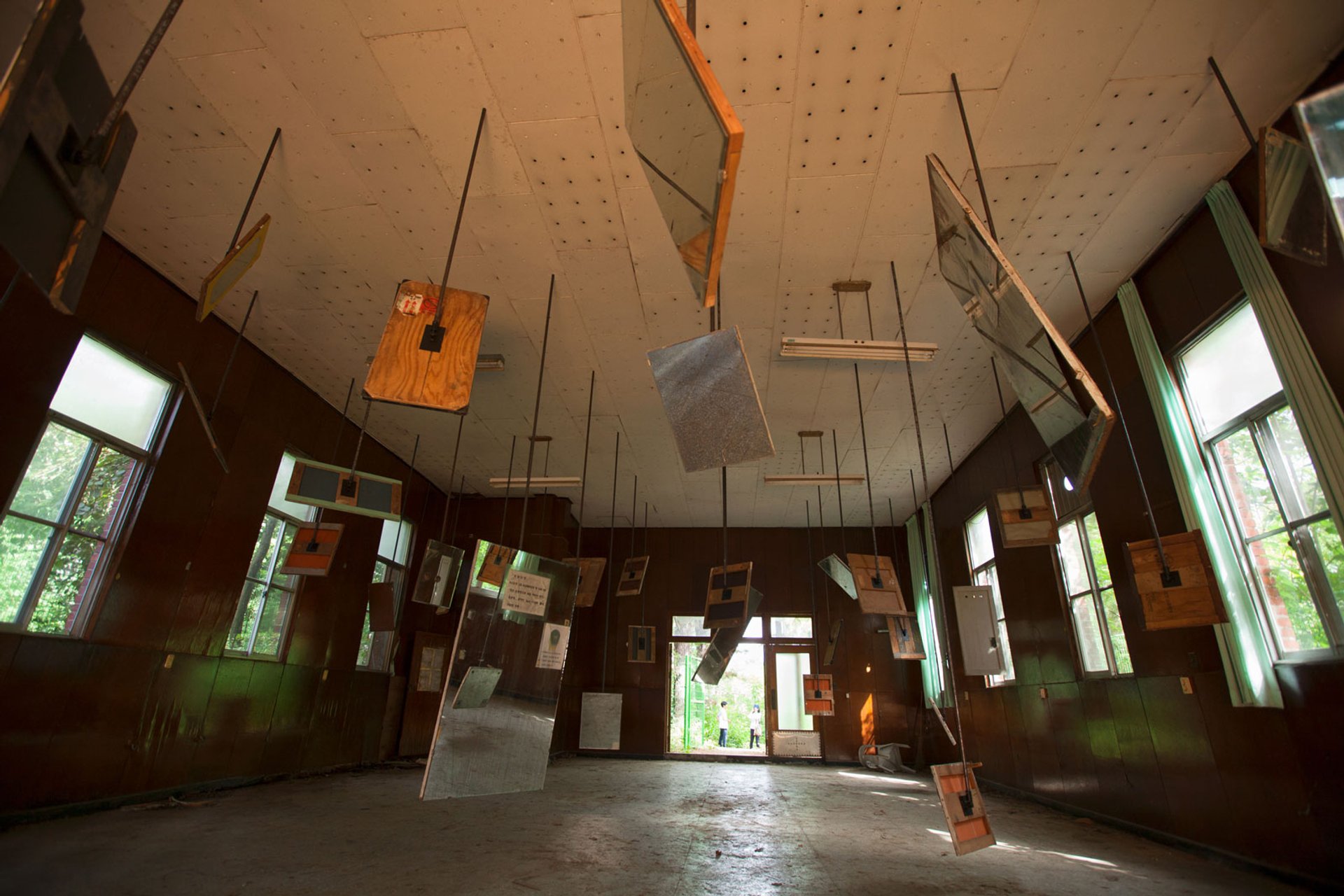 Additionally, the derelict Former Armed Forces’ Gwangju Hospital and nearby chapel, situated within a memorial park, present site-specific commissions. Apichatpong Weerasethaku's installation Constellations, ghostly movements in the public spaces of the decaying hospital, was still being installed at the time of the opening. Mike Nelson's Mirror reverb (the blinding of a building, a notation for another) consists of time-worn bathroom mirrors, emblazoned with hygienic and sometimes political exhortations, removed from the hospital and hung at varying angles around the small abandoned chapel's theatre-like hall, creating a literal temple of reflection.