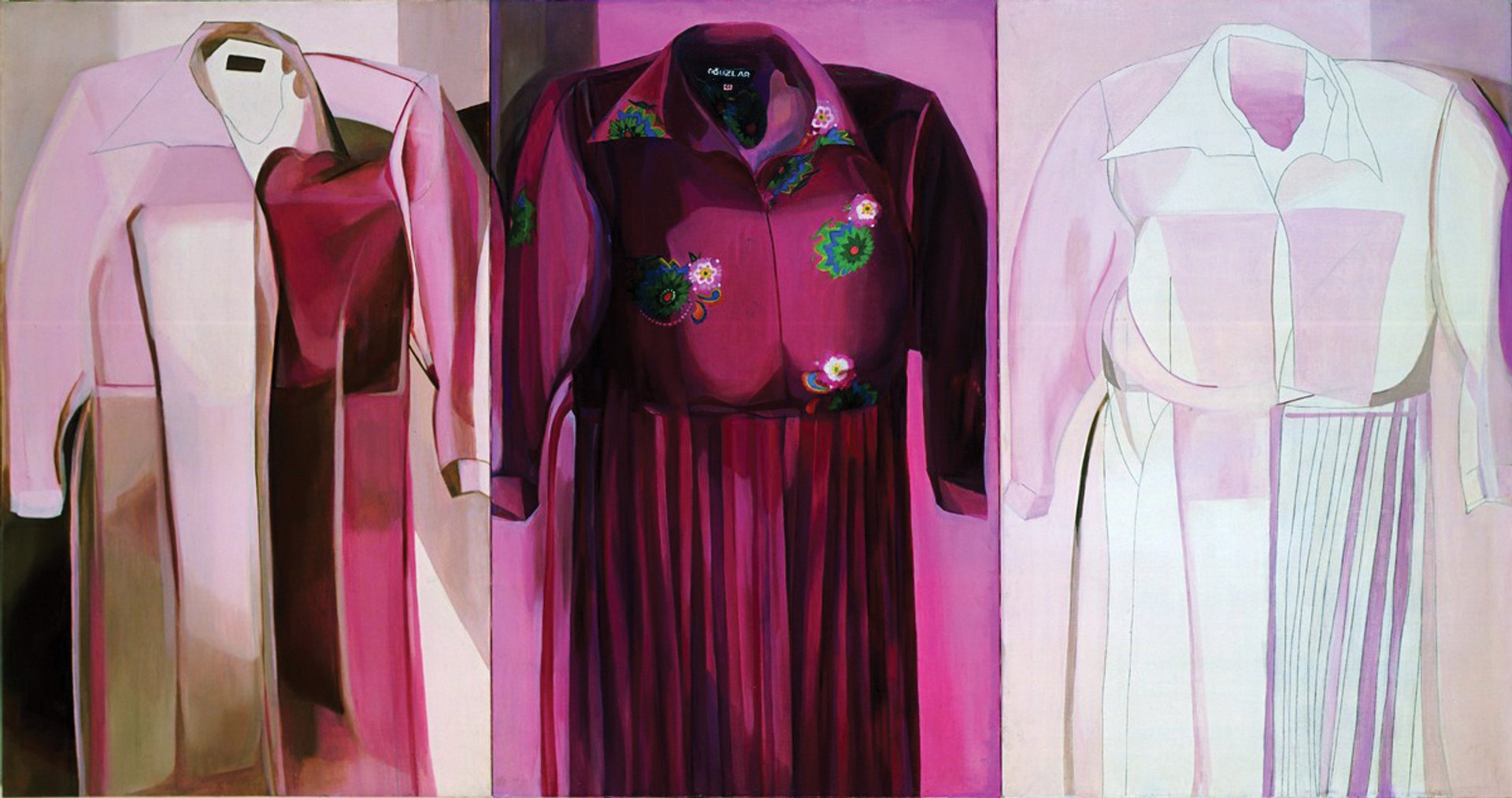 Clothing also forms the subject of the Sherife series of paintings by Duben, who returned to her native Istanbul in the late 1970s after studying in New York and realised that “as an artist, I had to come to terms with my own personal and cultural roots and the whole question of family identity, sexual identity and religious identity.” The paintings take their name from Sherife, a cleaner from an Anatolian village who had been abandoned by her husband. “She would not agree to model for me, as for her it would constitute a sin,” Duben remembers. Duben chose to depict her clothes instead. “I painted the headless Sherife contained in a shapeless dress, which revealed nothing about her physical presence and represented her absence. At the time I felt I had painted an iconic Turkish woman.”