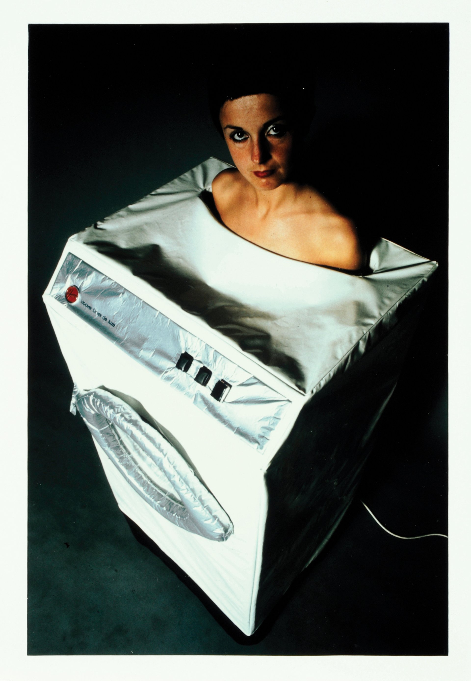 A performative strand runs through much of the section. The photographic series In the Kitchen (1977) presents Chadwick’s wryly humorous parody of the enslaved domestic goddess. The series shows the artist dressed in elaborate and cumbersome sculptural costumes—an electric cooker, a fridge freezer, a sink unit and a washing machine—which conflate the female body with the domestic machine.