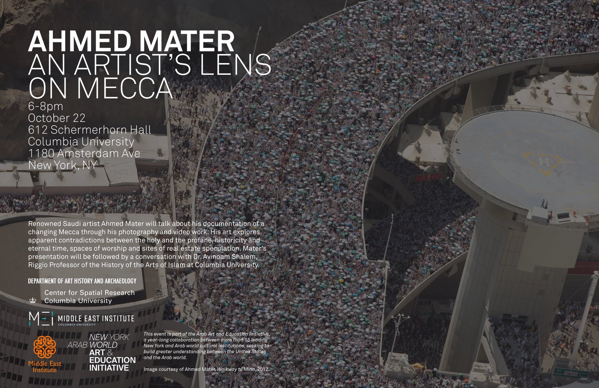 A poster for the cancelled talk Ahmed Mater: An Artist's Lens on Mecca, at Columbia University