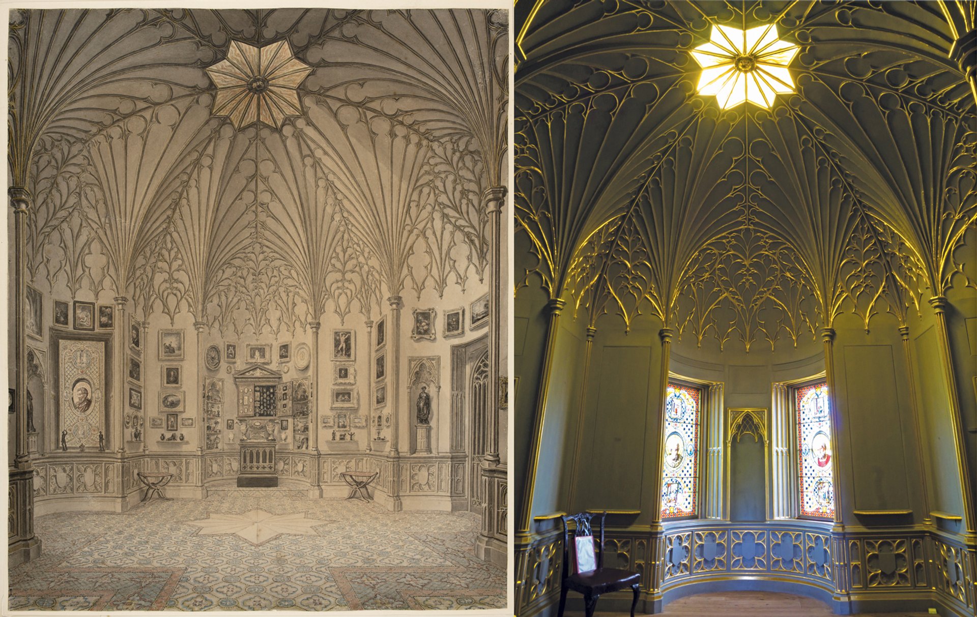 The Tribune at Strawberry Hill, Horace Walpole’s “little Gothic castle” in a drawing by John Carter (left, around 1789) and in Twickenham, today (right) Left: courtesy of the Lewis Walpole Library, Yale University. Right: Justin Coe