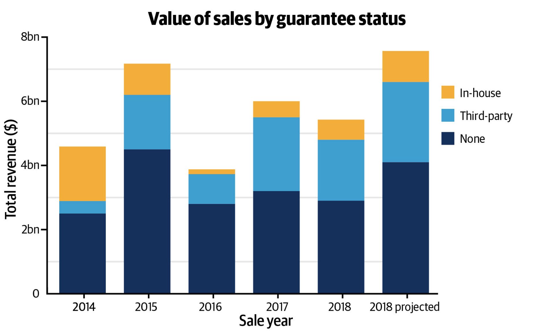 Data gathered by one guarantor’s in-house analysis team, from all auctions including guaranteed lots at Christie’s, Sotheby’s and Phillips, predicts that sales of lots covered by third-party guarantees will reach a high of $2.5bn by the end of 2018. So far this year, sales covered by third-parties have totalled around $1.9bn