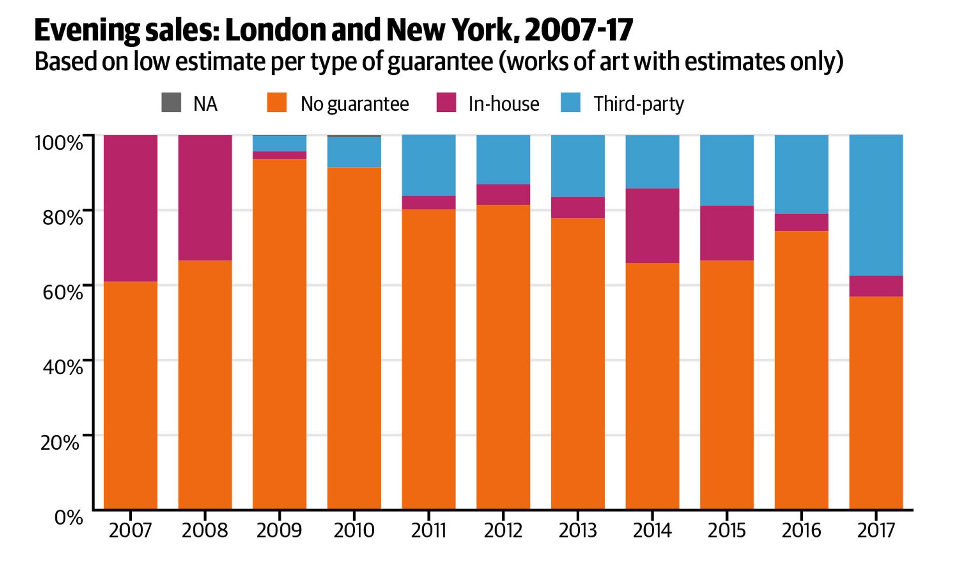 Pi-Ex’s data from Impressionist and Modern, and post-war and contemporary evening sales in London and New York over the past decade shows that although the number of in-house guarantees shrank dramatically following the financial crisis of 2008, works guaranteed by a third party have grown to 37% of total sales by value in 2017