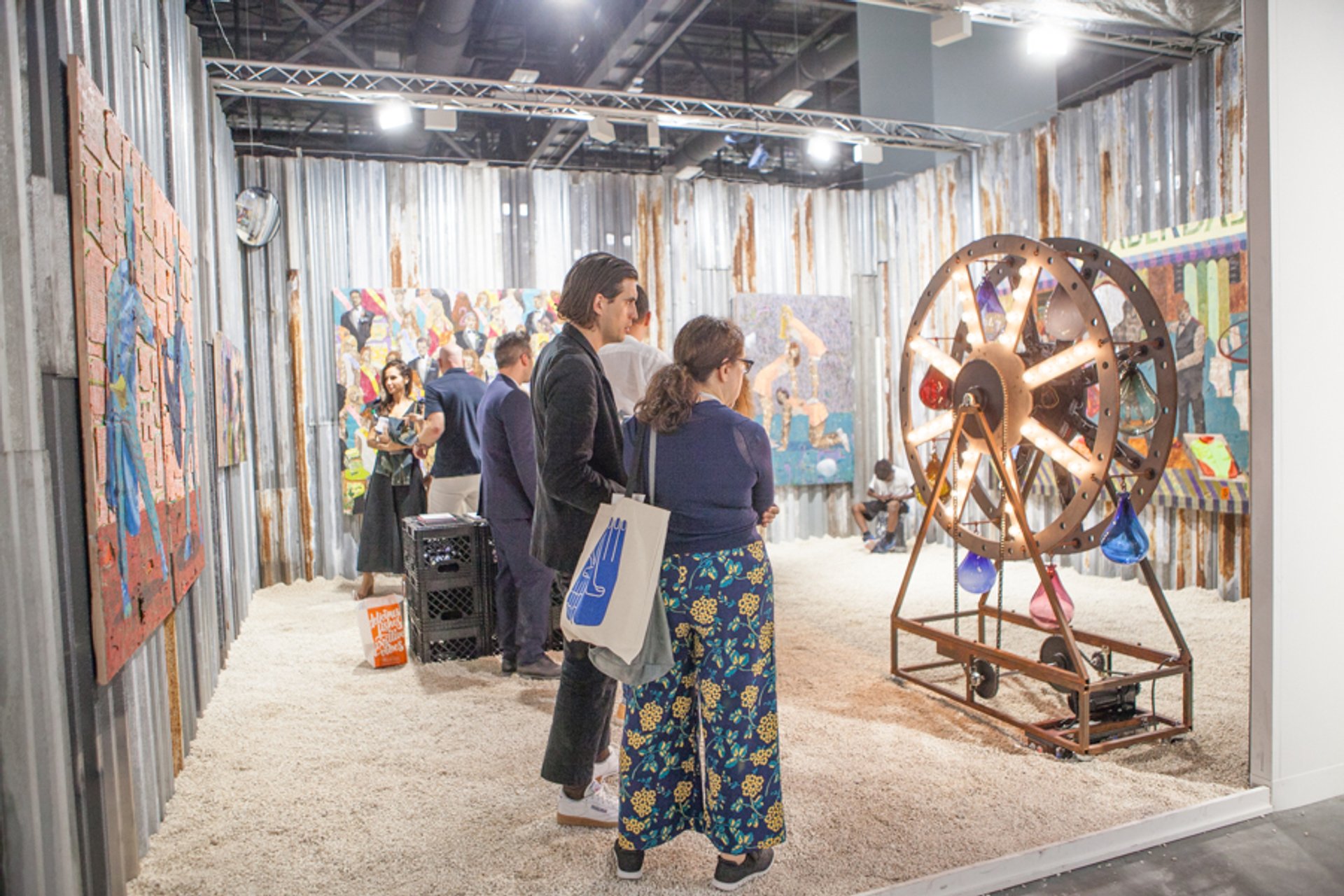 Two local children are taking it in turns to man Josh Lilley’s stand in the Nova section of Art Basel in Miami Beach, as part of the artist Derek Fordjour’s rough-hewn installation Backroom. The brothers are not actors; Fordjour wanted to introduce the future of the “real” Miami to the fair. Lilley says: “We all just come here for a week and end up engaging so many people in this city without even thinking about who they are.” Of the eight mixed-media works on the stand, seven had presold; the remaining piece, Haberdashery (2018), was being held for one of several interested institutional buyers.