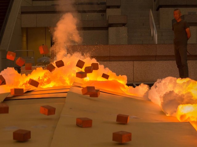 Cai Guo-Qiang overseeing the ignition of his gunpowder painting Study of Birds (2018) Photo: Tatsumi Masatoshi; courtesy of Cai Studio