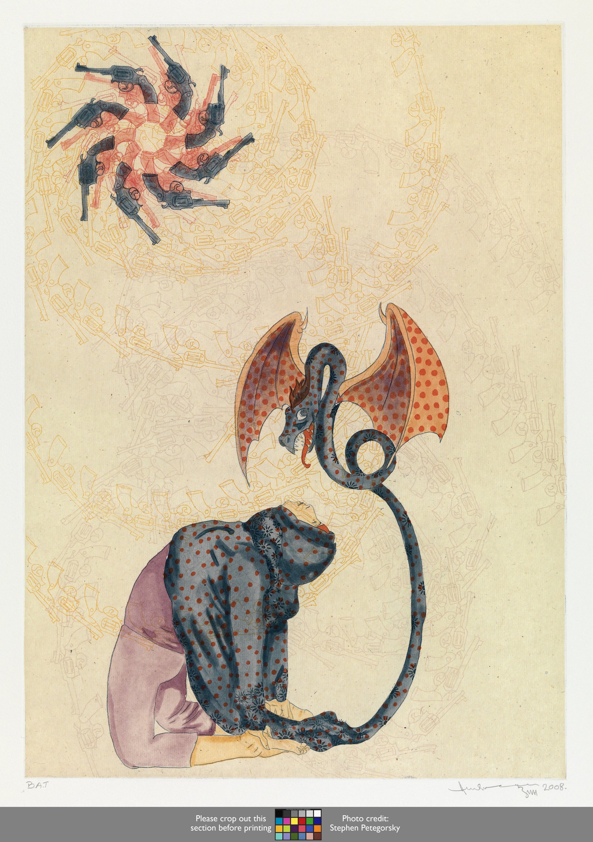 Ambreen Butt, Untitled (Woman/Dragon) (2008), from the series Daughters of the East, etching, aquatint, spit-bite aquatint, drypoint, and hand colouring on paper © Ambreen Butt. Courtesy of the artist. Photo: Stephen Petegorsky