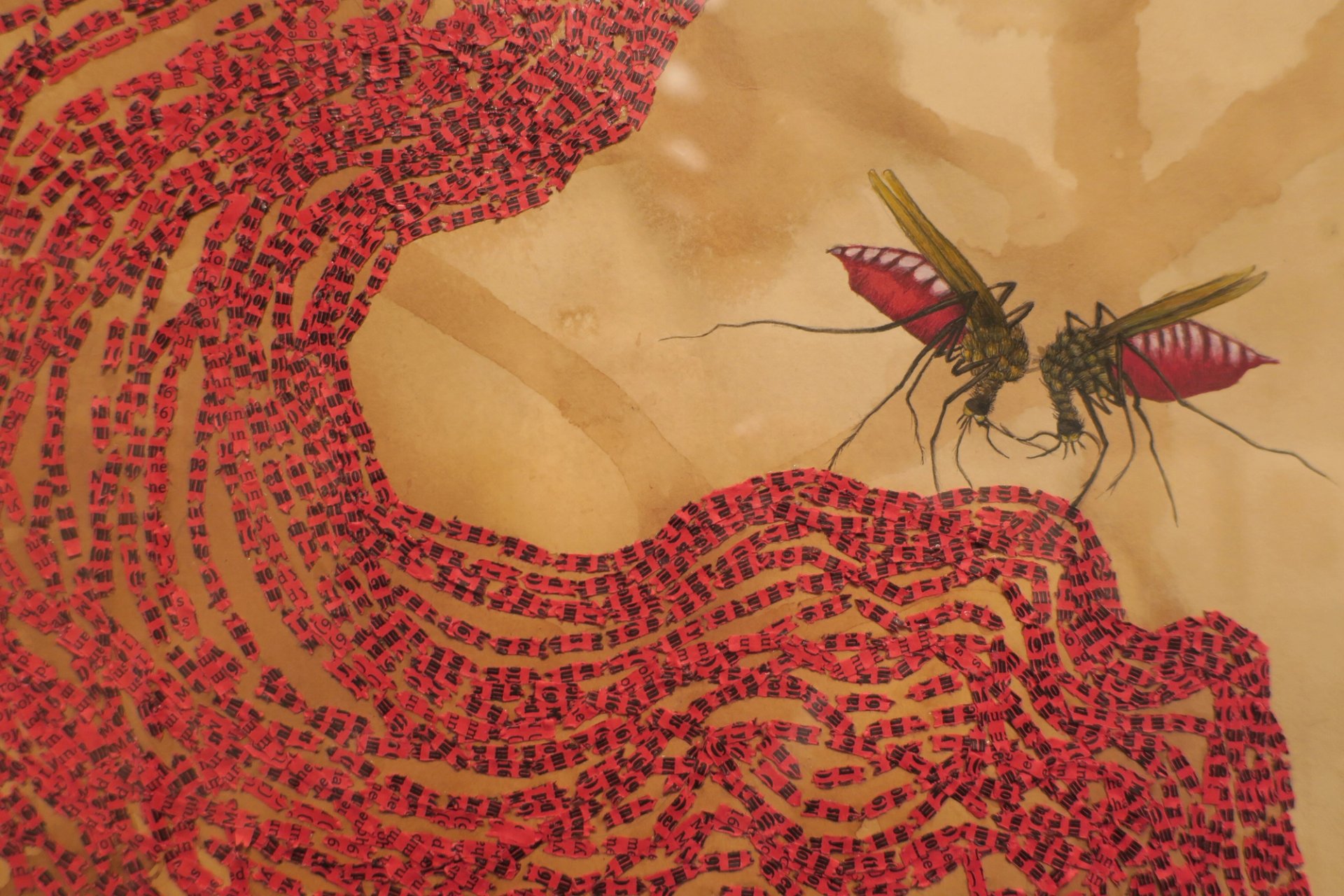 Other common motifs in the show are mosquitos, ladybugs, dragons, and tigers, which play symbolic and complicated roles. Butt often builds up multiple transparent mylar layers, creating deconstructed miniature paintings where ghostly figures derive from medieval history and current events. The artist, who trained in miniature painting at Lahore’s National College of Arts, also puts her own spin on her multimedia works by sewing, etching, and gluing them.