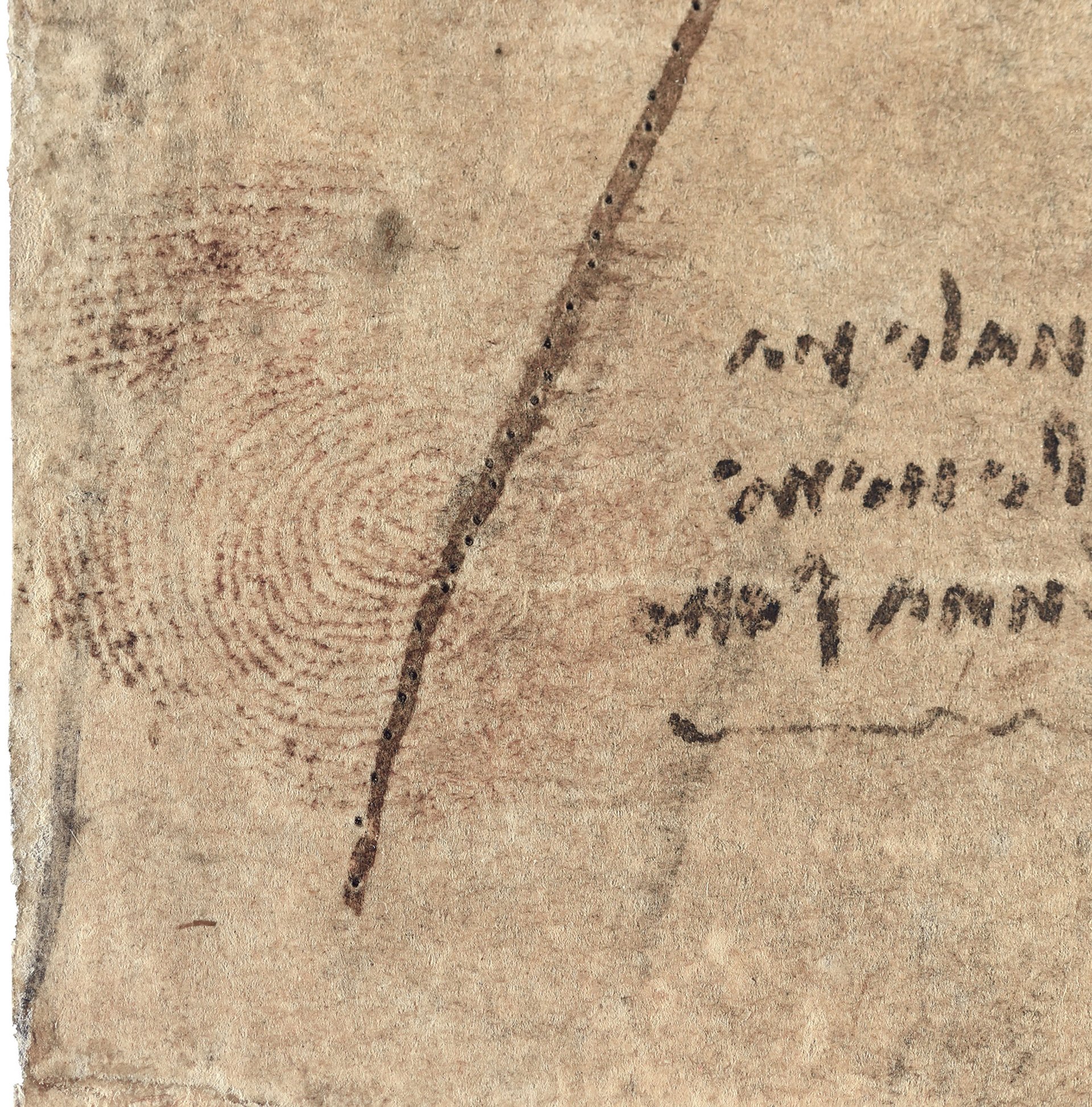 The sheet with the thumbprint is entitled The Cardiovascular System and Principal Organs of a Woman (around 1509-10). Although fingerprints have been found on other Leonardo drawings, Donnithorne describes the one on the medical sheet as “the most convincing candidate for an authentic Leonardo fingerprint” among the Queen’s 550 or so Leonardos.