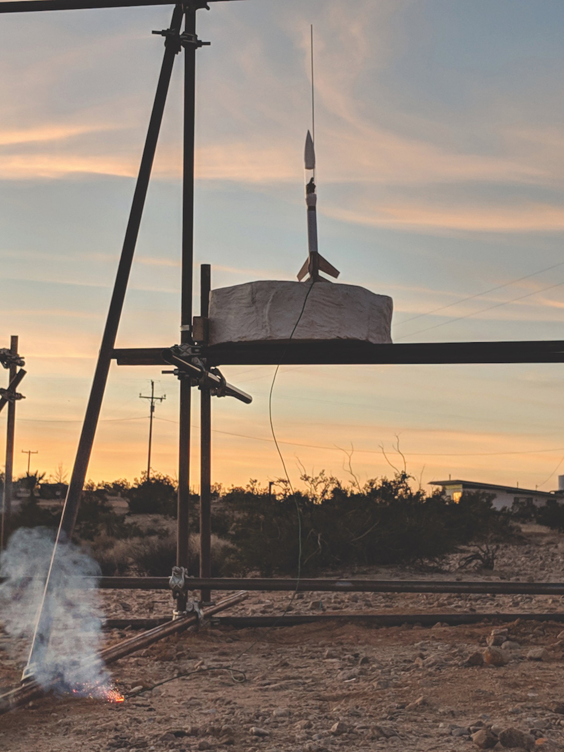 The artist Charles Long bellowed the countdown to the launch of his model rocket— “11… 16… 107… 4,562…”—before the rocket blasted off into the sky above Alice Wang and Ben Tong’s Magic Hour art space, tucked off a dirt road out in the middle of the desert landscape of 29 Palms, California. Then, nothing. “I think the fuselage didn’t open,” Long opined. “Which happens,” he tacked on, wryly. Long is a consummate master trickster. His recent show at the Hammer Museum featured “the strange correlation in form between the surface of the severed tree stump and the cross-section of the human penis,” and this rocket launch was no ordinary space exploration. In the rocket’s aforementioned fuselage were several caps of psilocybin mushrooms (most of the attendees had sampled the payload “to make sure it was the real stuff,” said one woman with a giggle), and the opening was meant to spread spores of love and understanding into the atmosphere. Well, after a quick search in the bush, we found the rocket, and it had indeed broken apart: mission accomplished. “That’s one small sliced dick for man, one giant absence of a phallus for mankind,” Long said triumphantly.