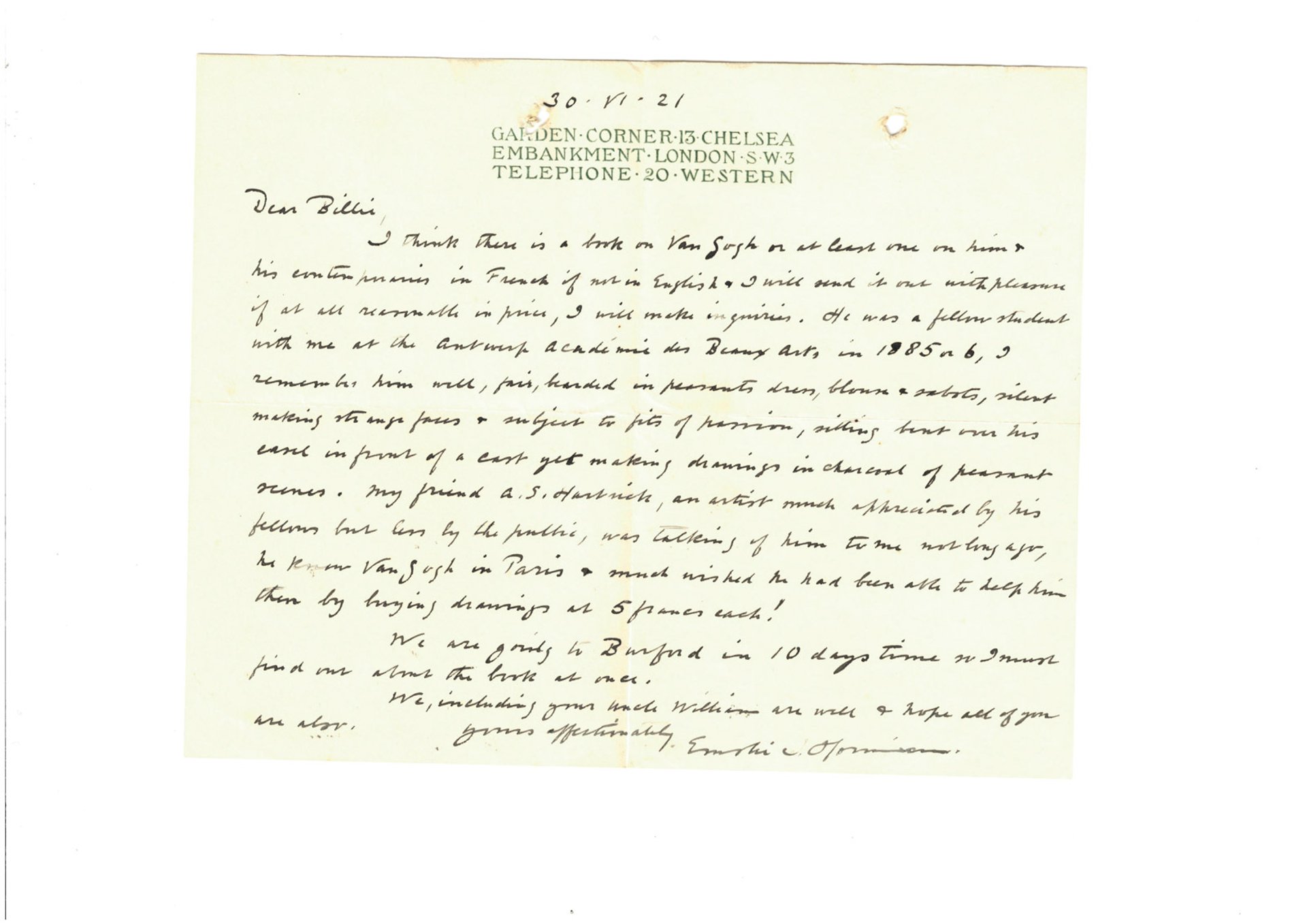 Letter from Emslie Horniman to William Plomer, 30 June 1921, Durham University Library (Plomer mss 324)