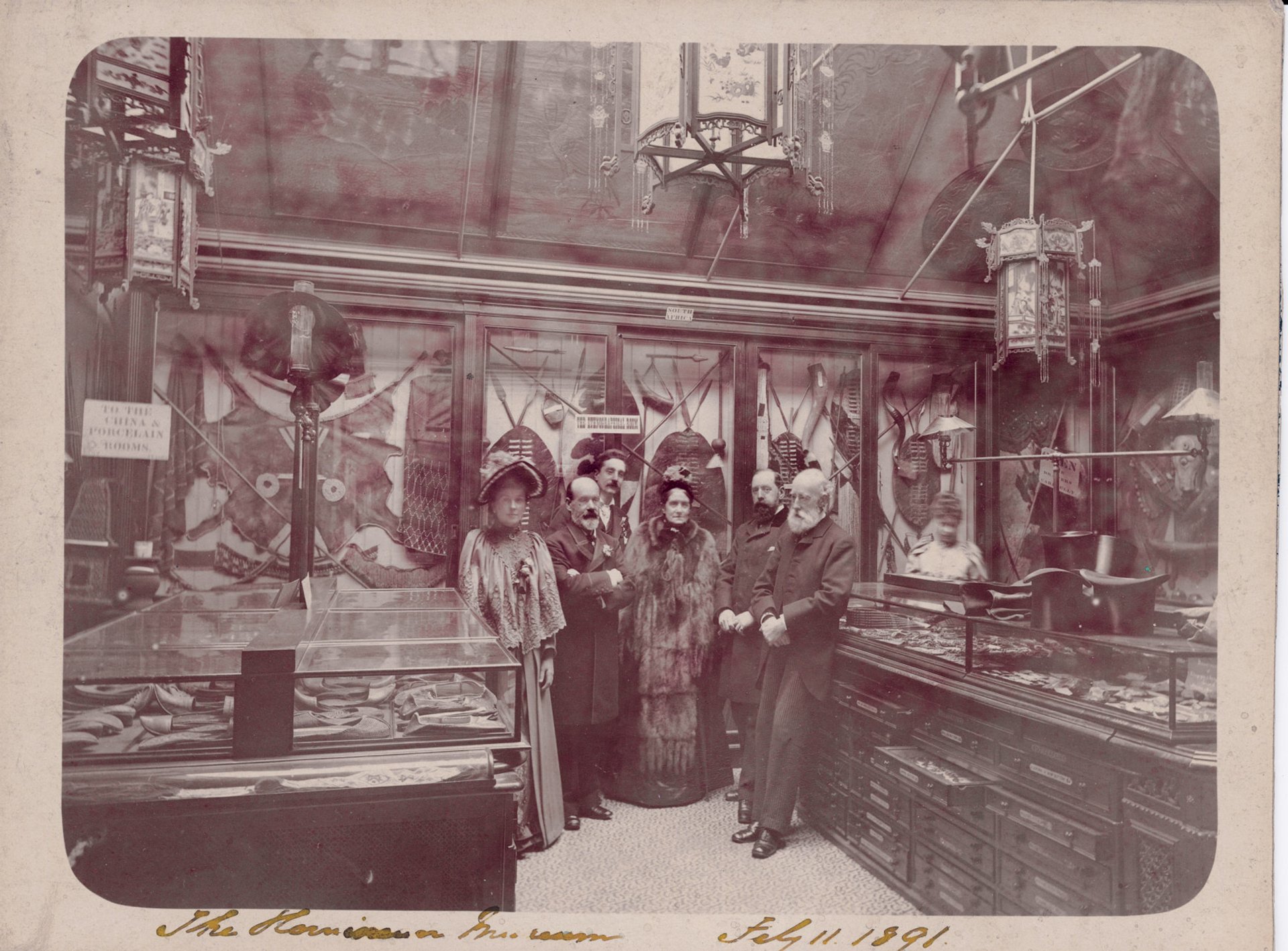 The Hornimans in the Ethnographical Saloon of the museum in their house, 1891. Frederick, who founded the museum, is second on the left, with Emslie behind him © Horniman Museum and Gardens