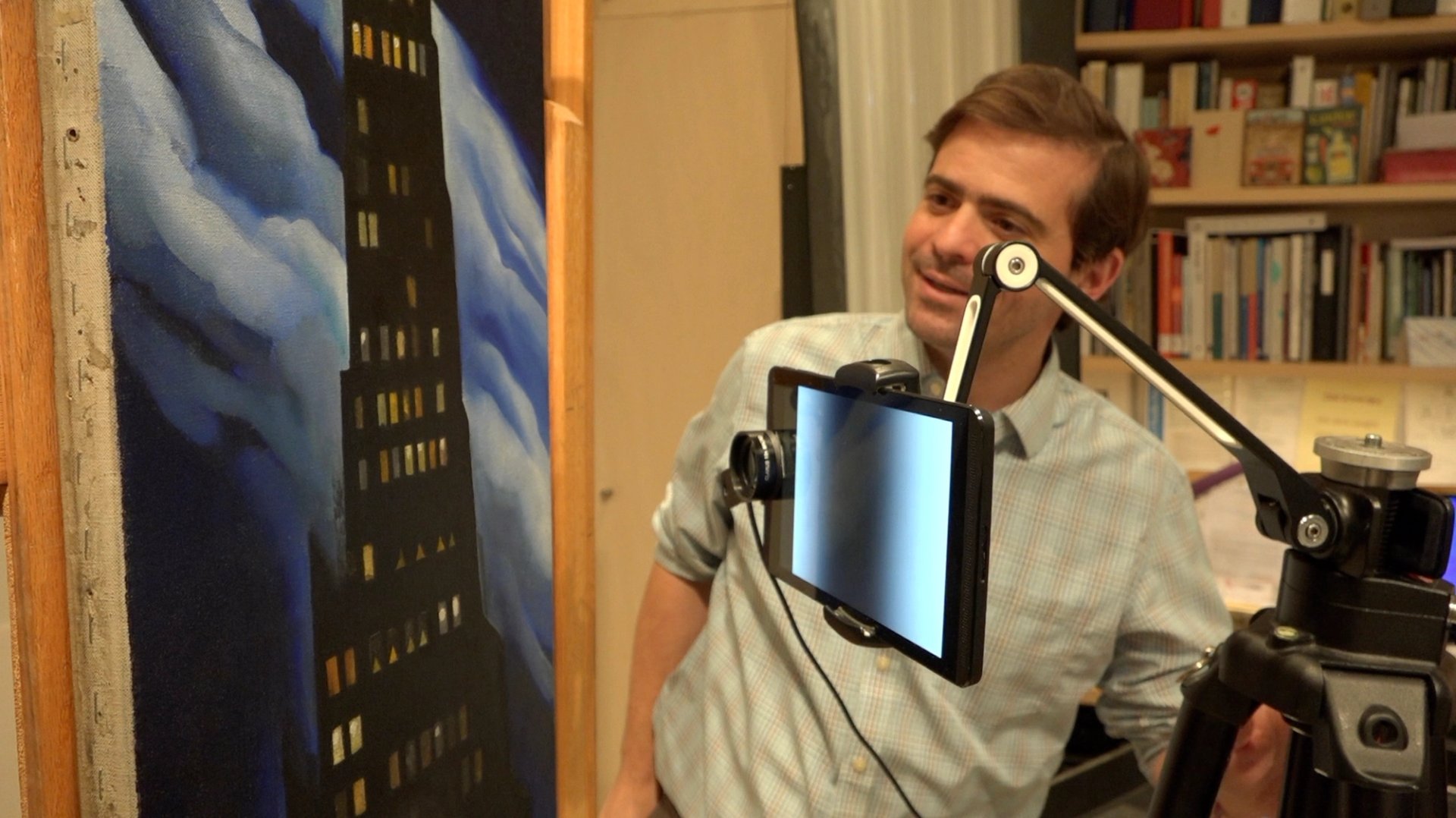 Oliver Cossairt, associate professor of computer science in Northwestern's McCormick School of Engineering, using a tablet to study the 1928 Georgia O'Keeffe painting Ritz Tower Dale Kronkright /© Georgia O'Keeffe Museum