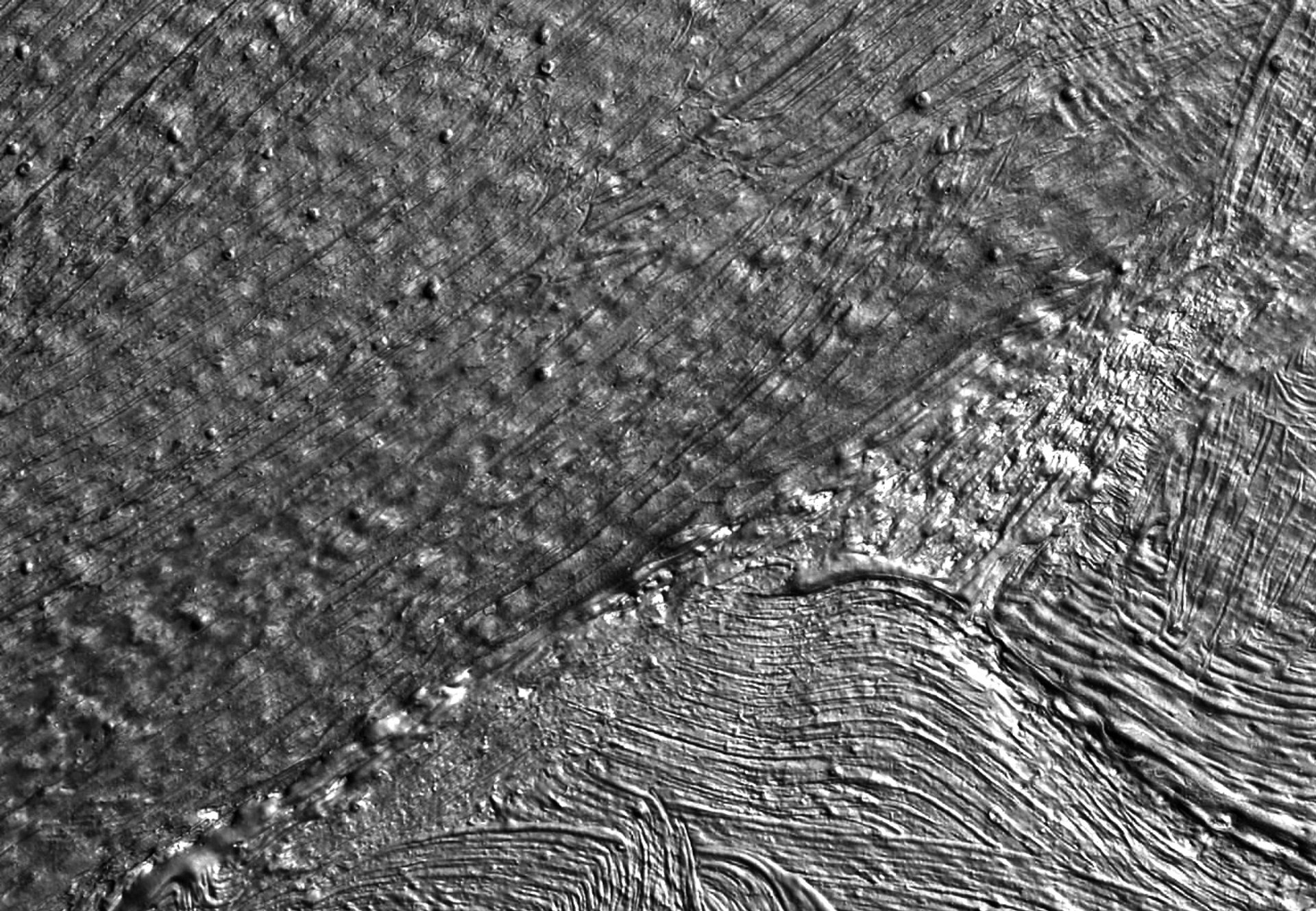 Removing the colour from a 5-cm detail of Georgia O'Keeffe's Pedernal allows researchers to more easily distinguish metal soaps from brush strokes and canvas texture Dale Kronkright/© Georgia O'Keeffe Museum
