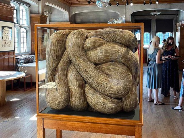 The UK artist duo Sophie Thomas and Louis Thompson will show a piece entitled Broken Ocean which ruminates on the issue of ocean plastic. “Working with hand blown glass and waste glass fragments, found ocean plastic from Hawaii and other beaches around the world and recovered ghost nets, this series of pieces references the chaotic beauty of an entangled ghost net being pulled out from the deep ocean,” they say. Works on show include hand-blown glass bottles with waste glass fragments melted into the surface.