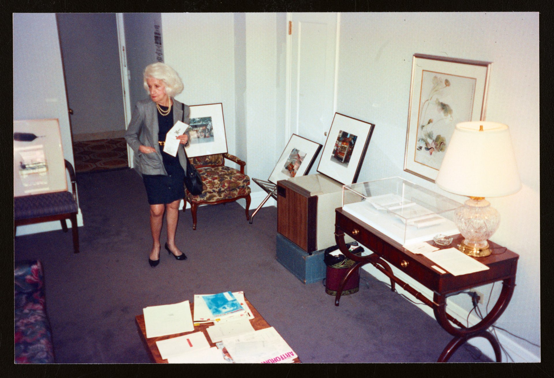 A fairgoer browsing in one of the hotel’s rooms (1994) Photo: Colin de Land Collection 1968-2008: courtesy of the Archives of American Art/Smithsonian Institution