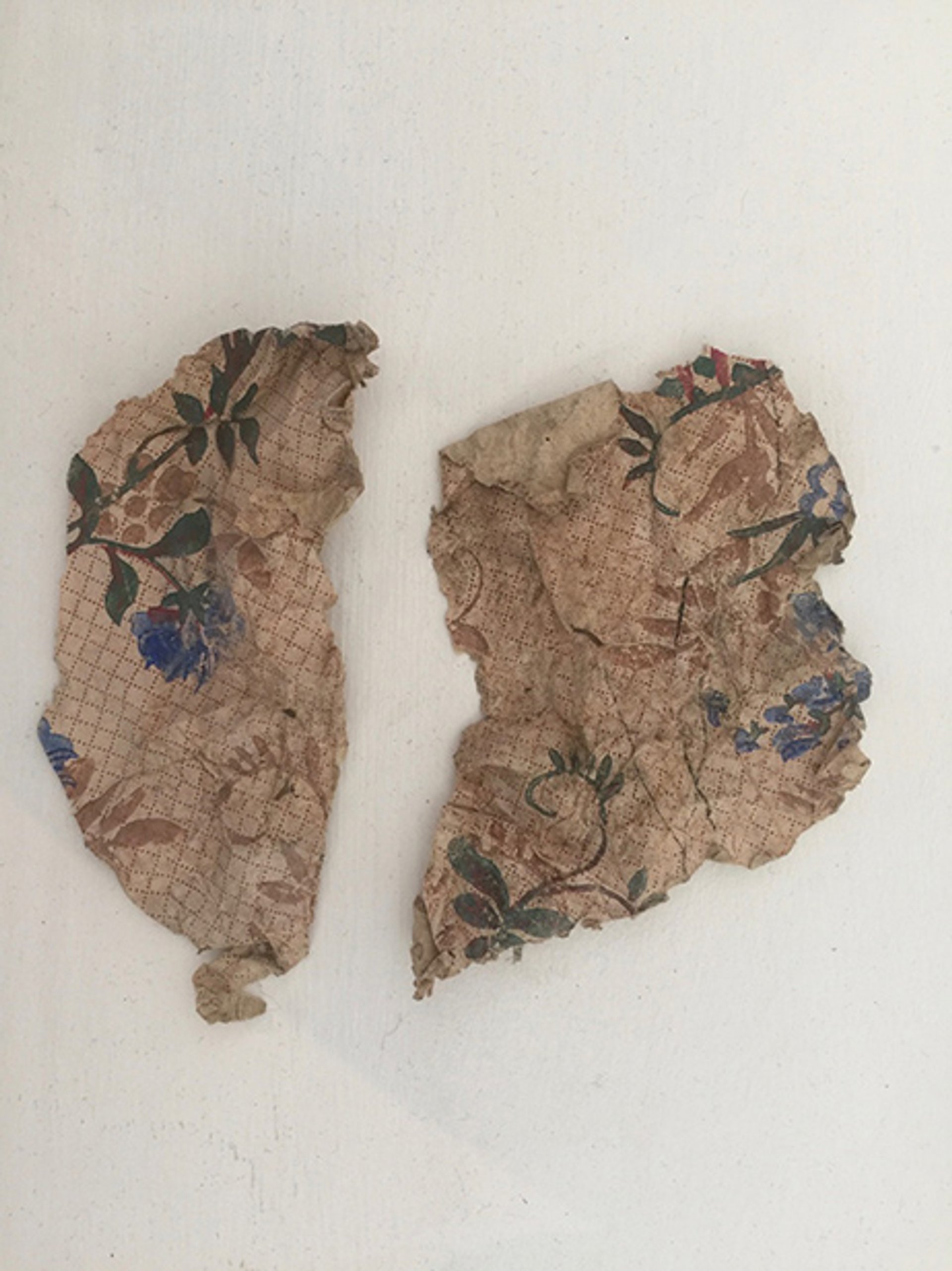 Fragments of paper with flowers found under the floorboards in Van Gogh’s bedroom, now with Jian Wang and Alice Childs. © Martin Bailey