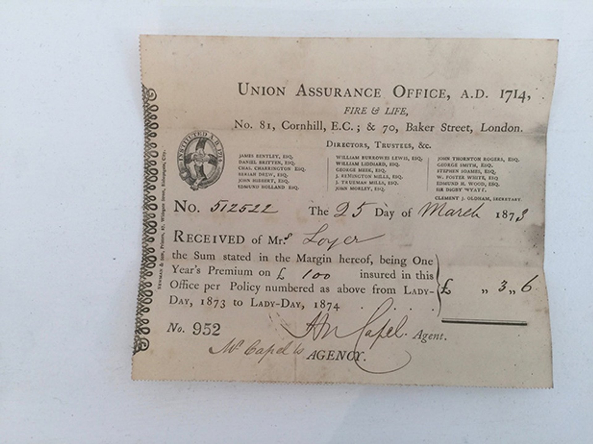 What has not been reported are the intriguing discoveries which were made during the renovations. Hidden behind a board in the attic timbers, a set of insurance documents were found bearing the name of Ursula Loyer as the policy holder, two of them dating from the very years when Van Gogh lodged with her. The house, valued at £100, was then insured against fire for a premium of 3 shillings and 6 pence.