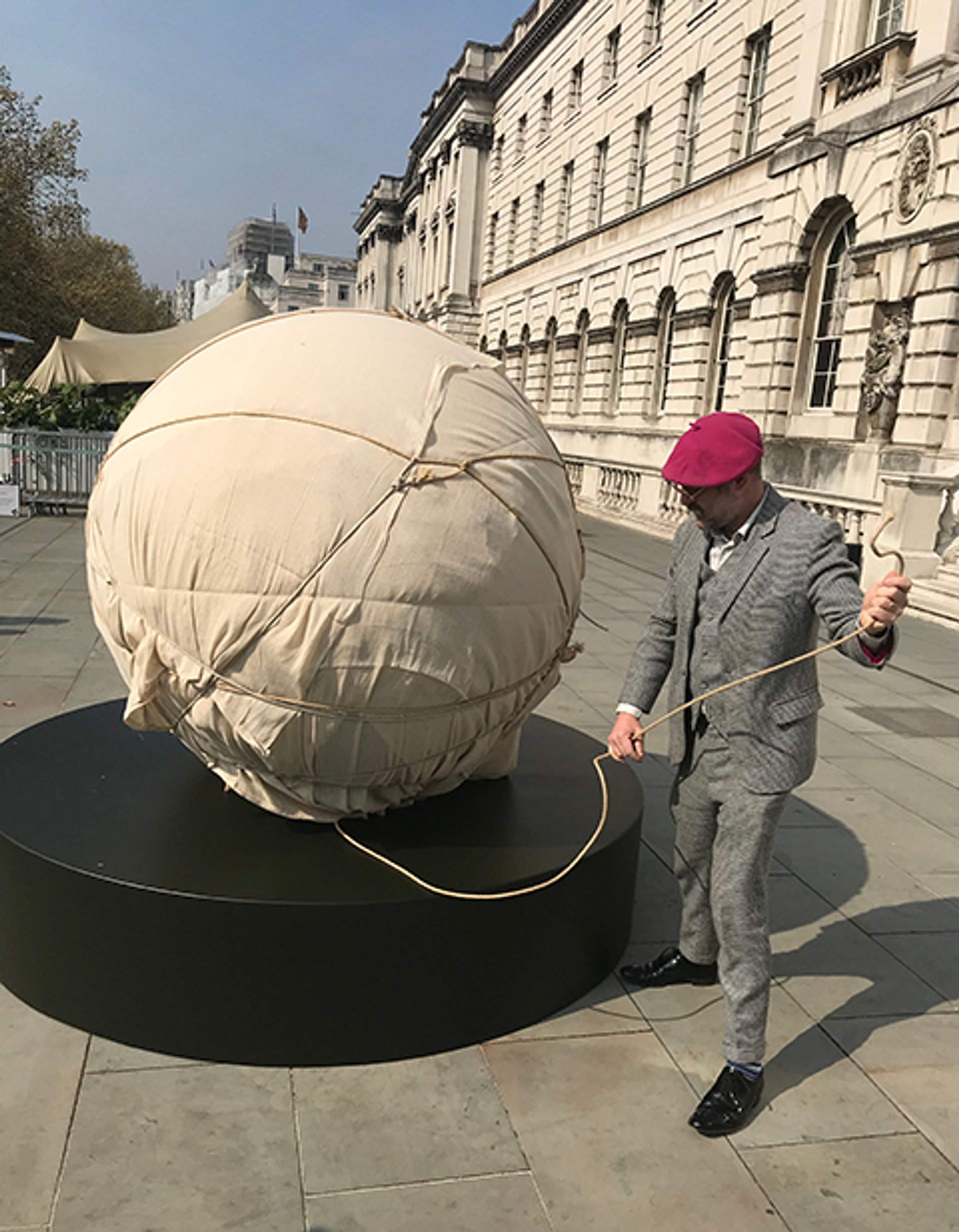 Easter came early to Somerset House as Gavin Turk unveiled a giant bronze egg on the building's River Terrace yesterday morning. Oeuvre (Verdigris) (2018) was wrapped up—Christo style—in white canvas and bound with rope and as Turk slipped the first knot and proceeded to unravel its lengths, he confided that his egg obsession stretched back to 1992. This was the year that Turk, having left college and begun thinking “about how art functioned and what art was for,” took the egg as his personal logo. Since then, this maestro of art-historical appropriation has proceeded to use the egg in multiple incarnations, from Magrittean photo portraits of an egg-headed artist to pierced Fontana-style ovoids and Piero Manzoni-esque boxes of multiple eggshells. “It’s the biggest floating signifier you could find: it’s narrative, figurative and abstract all simultaneously—and highly unoriginal as well—which is complicated but something I can handle,” he says.