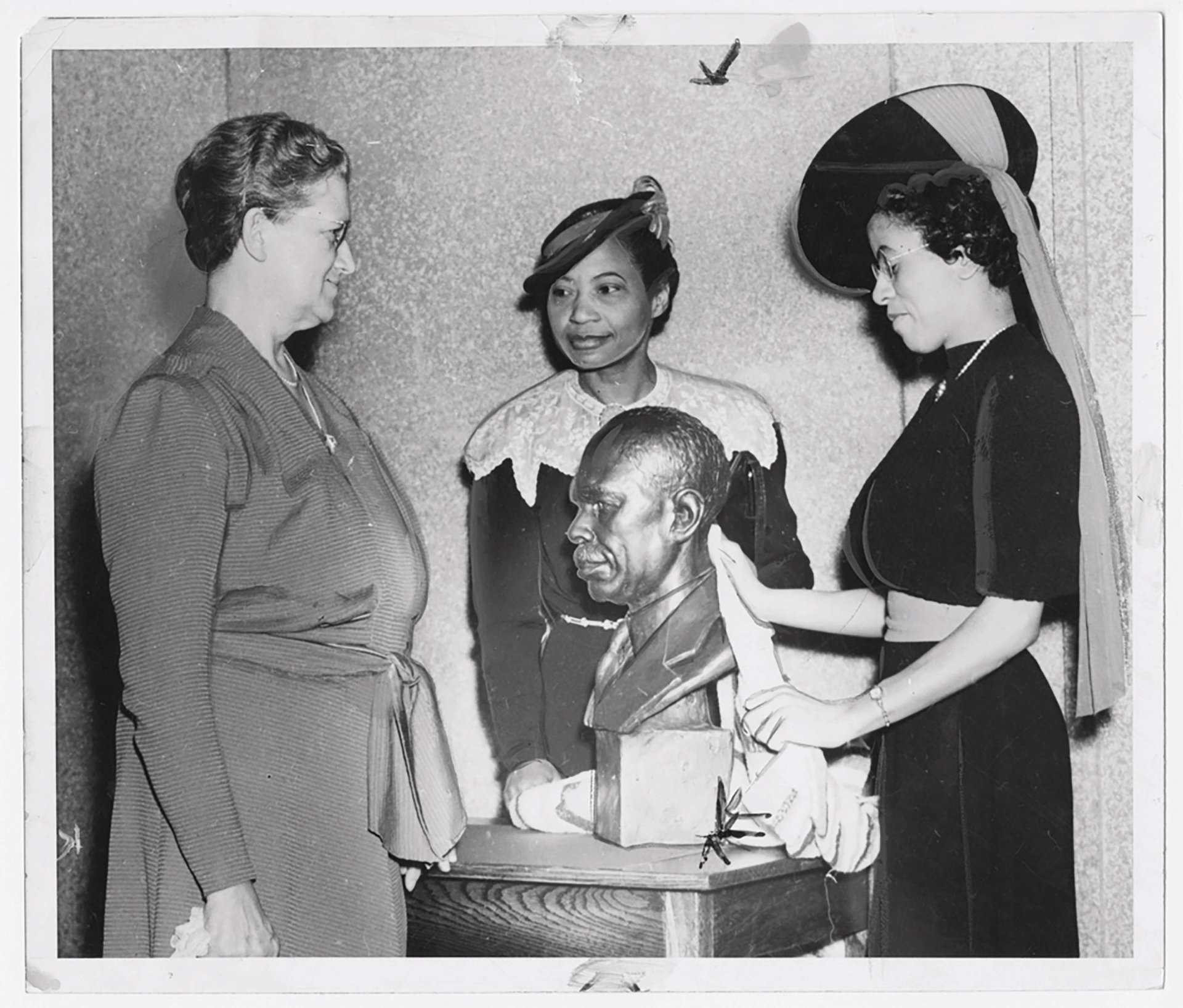 Augusta Savage (centre) with Ernestine Rose, Roberta Bosley Hubert and her sculpture of James Weldon Johnson, 1939 Image courtesy Schomburg Center for Research in Black Culture