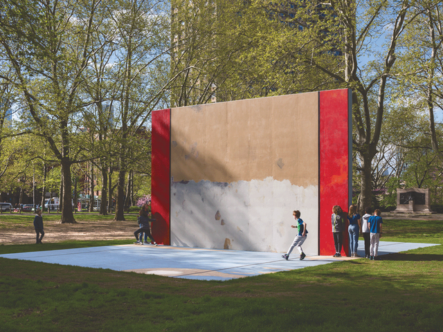 The public will be free to engage with the results as they wish. “People will see immediately it’s not a regulation court so they might play a modified version of handball,” says Palmer, noting that the game was originally invented by immigrants who poured the concrete for many of the city’s courts during the Great Depression and often congregated in these democratic social spaces. “But I think it would be really beautiful if someone uses it as a bandstand or has a dance performance on it, or kids kick their soccer ball against it or play tag against it.”