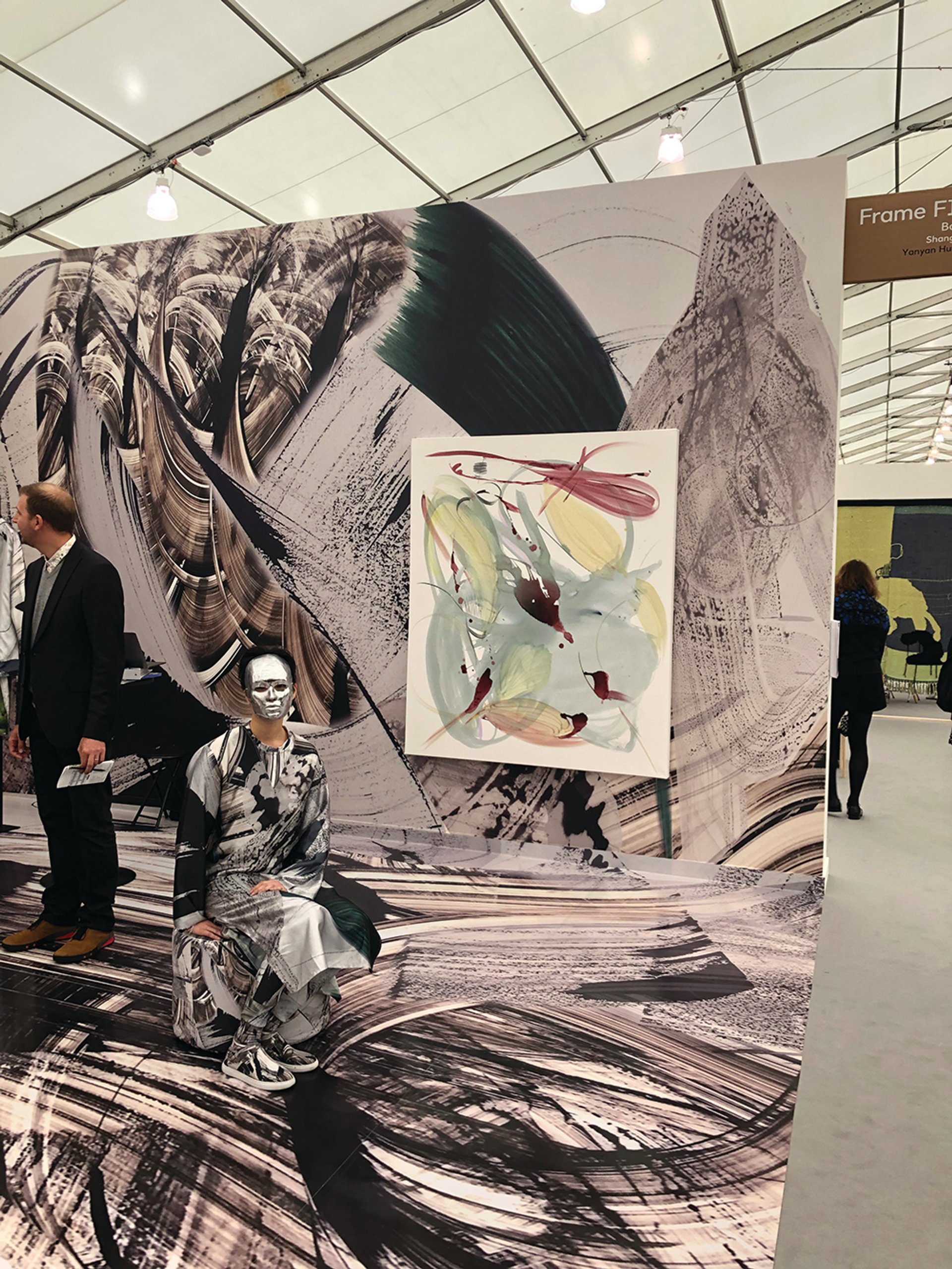 The Chinese artist Yanyan Huang brings her real-life penchant for fantasy and role-playing to her solo presentation with the Shanghai gallery BANK in Frieze’s Frame sector. A masked performer models a silk robe patterned after Huang’s rhythmic ink studies, matching the booth’s wallpaper, flooring and even the clothes of the gallerist. He jokes that the striking mise-en-scène was designed to be an excellent cover photo. Another artist who famously enjoyed dress-up, Leonor Fini, is featured at the New York gallery Leila Heller’s stand, including an anthropomorphic armoire and her Northern Renaissance-meets-Surrealism paintings.