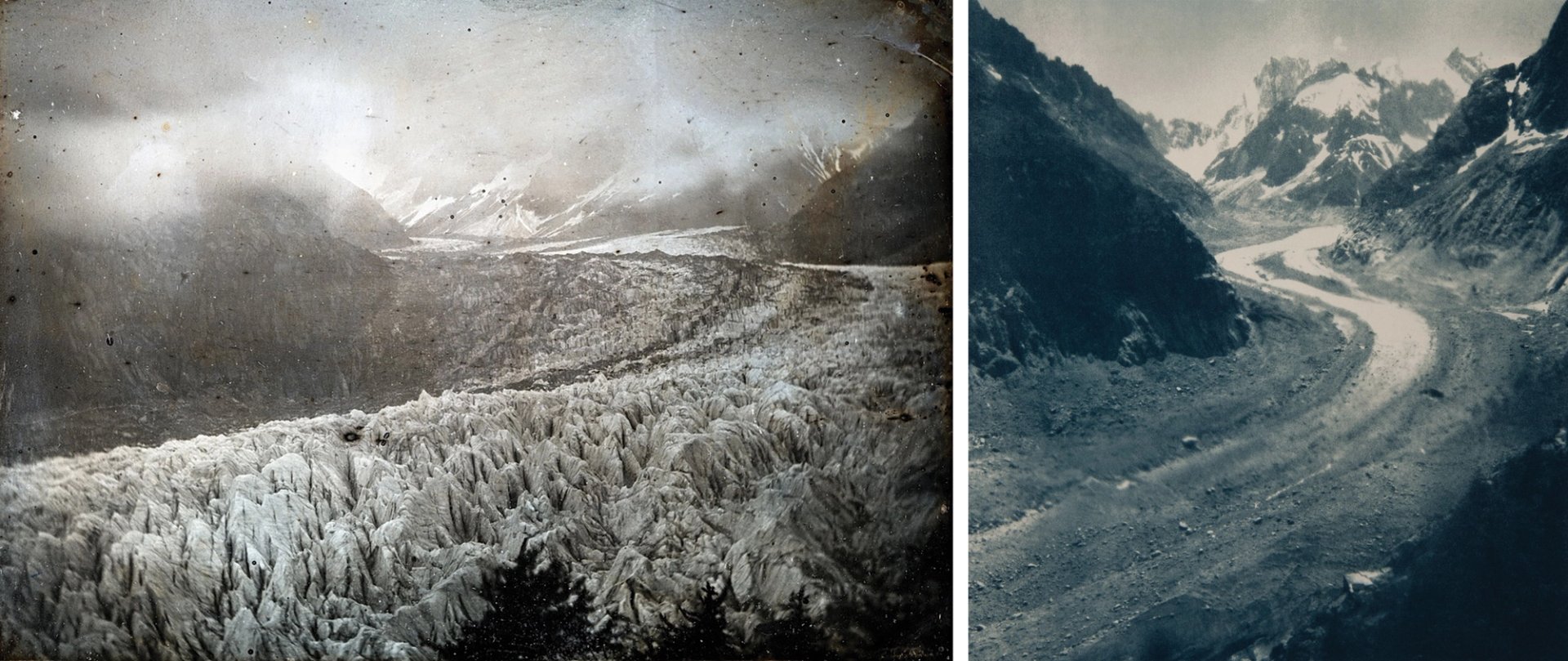 Left: Chamonix, Mer de Glace, Mont Blanc Massif daguerreotype, taken by John Ruskin and Frederick Crawley, June 1854. Right: Mer de Glace cyanotype, by Emma Stibbon, June 2018 1854: Courtesy of The Ruskin, Lancaster University. 2018: Courtesy of York Art Gallery