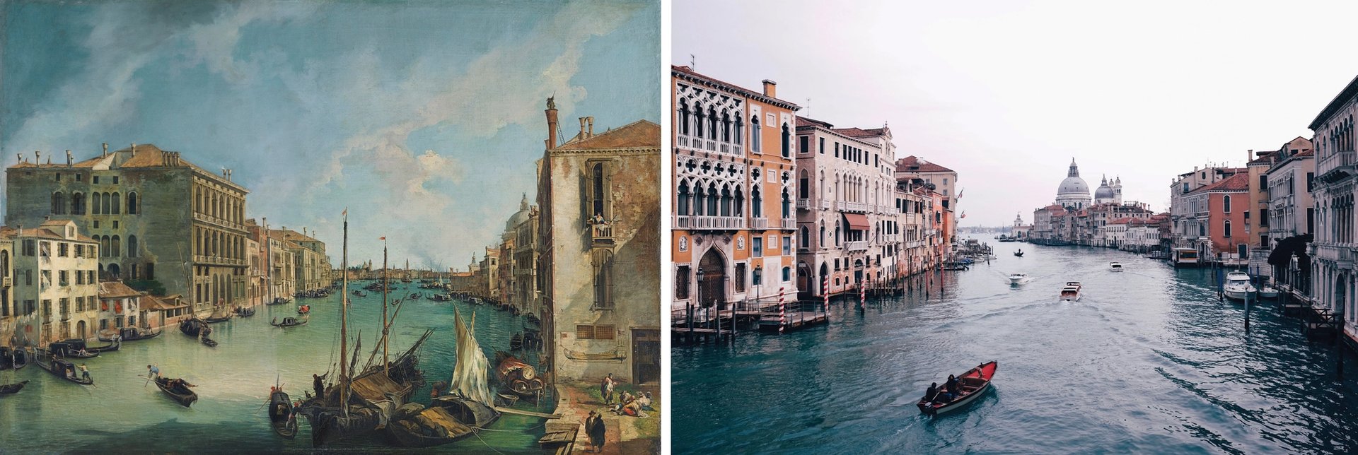 Left: Canalleto (Giovanni Antonio Canal), The Grand Canal from San Vio, Venice (1723-24). Right: Venice today Canalleto: Courtesy of the Museo Nacional Thyssen-Bornemisza, Madrid. Venice: Stijn te Strake