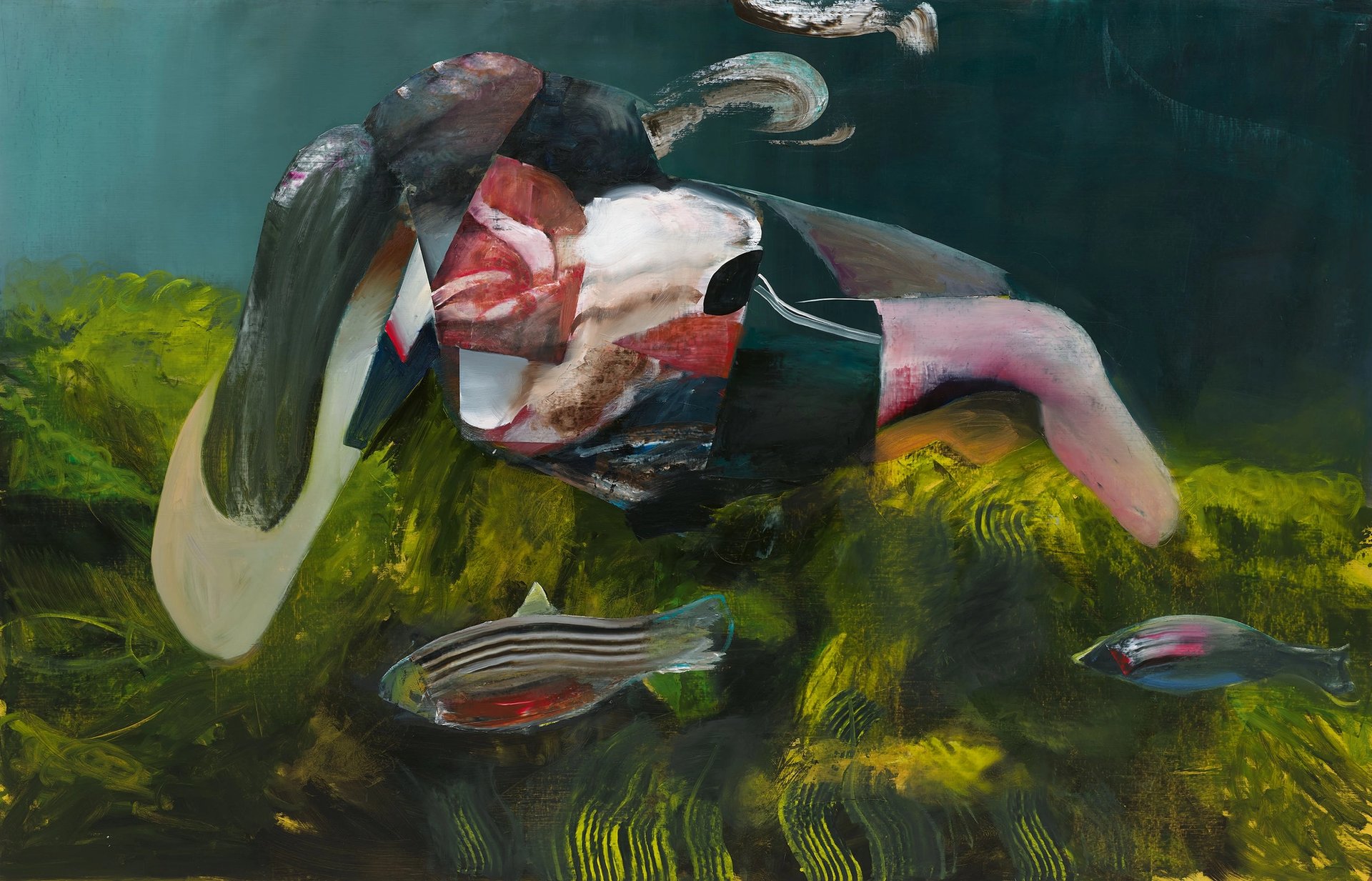 Regarding his technique and approach, he points out that “abstract art and figuration were in competition throughout the 20th century. Abstraction was the end stop for artists like Rothko; my painting is now more abstract.” Other works in the Venice show, which veer between different styles, include The Drowning (2019), depicting a distorted body encircled by tropical fish, and Self-Portrait with iPhone (2018).