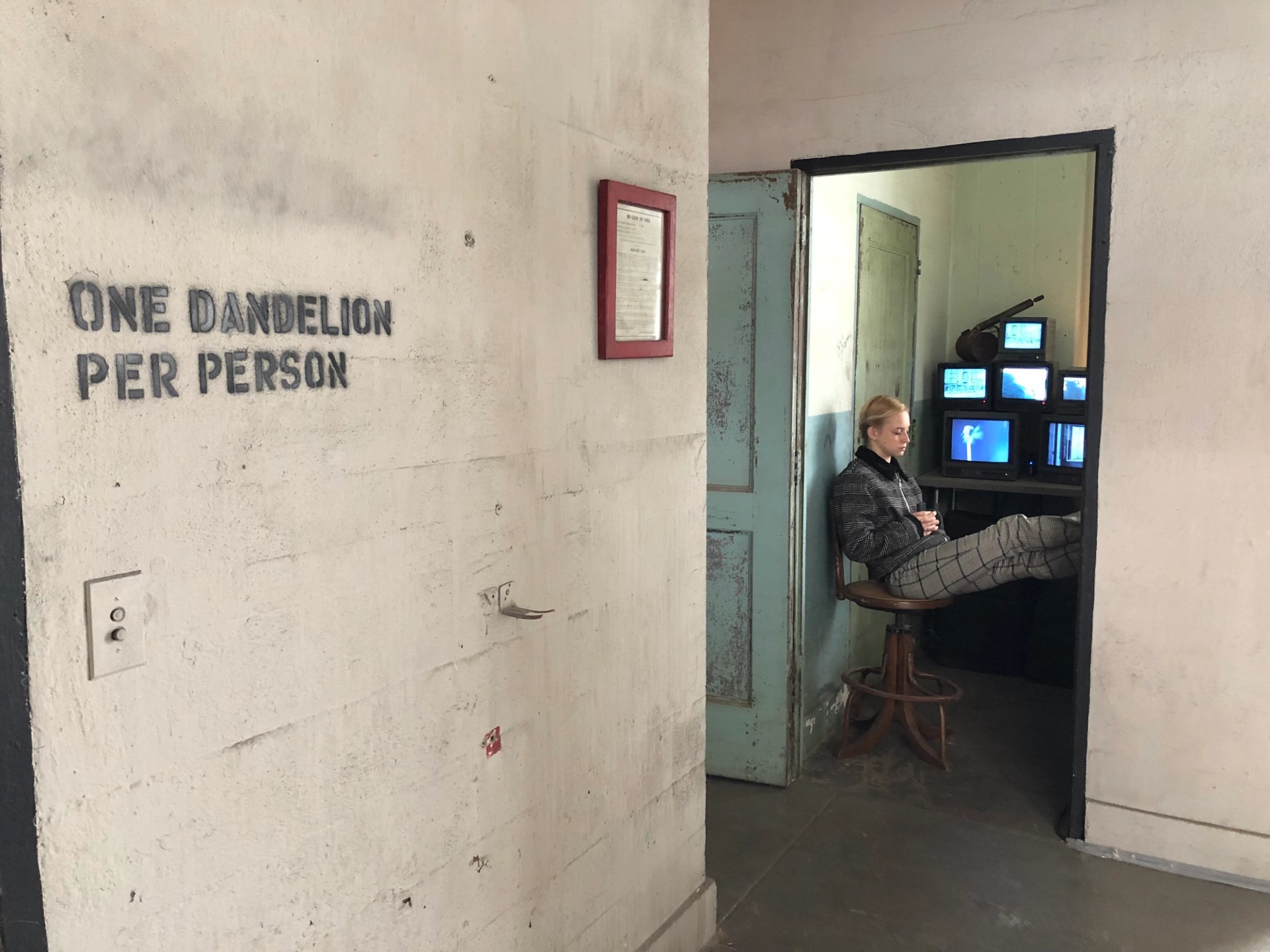 In that final room, you can watch the gentle drifting of dandelion fuzz through large windows, a mesmerizing form of drawing in space, and receive your own individual dandelion stalk for wish-making purposes. The three members of The Art Department I met on site (who work anonymously) explained that this light shower of dandelion puffs was the generating idea behind the entire project, which they developed after visiting various industrial sites from pickle factories to water treatment plants.