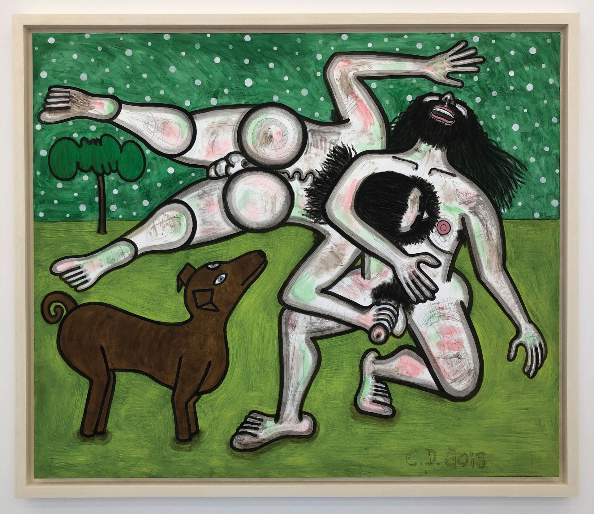 From Hauser & Wirth’s show on sexual desire to Monica Bonvicini’s glass penis sculptures at Peter Kilchmann, there was one thing on everyone’s mind at Zurich Art Weekend. This phallic fixation was most notable in Carroll Dunham’s paintings at Galerie Eva Presenhuber, which show two hirsute men wrestling naked, their rounded buttocks and thumb-like members depicted in cartoonish style. When asked how viewers should interpret these homoerotic pieces, Dunham replied that he doesn’t concern himself with what the audience thinks. Right on cue, his wife, the artist Laurie Simmons, came into the gallery and the power couple—the parents of Girls creator, Lena Dunham—disappeared into the crowd.