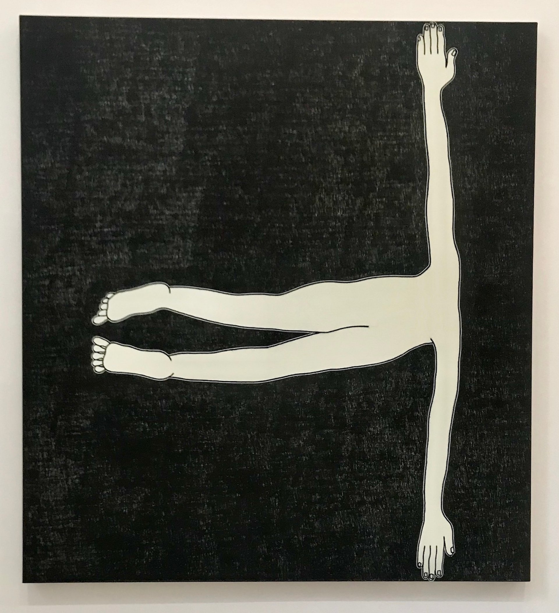 Each of the forty nine artists selected has a particular relevance to Stanley, yet the show is more than a parade of favoured works. It also coheres as an arresting, thought provoking show in its own right with conversations and connections running throughout. A counterpoint to Constable’s clouds is Michael Saistorfer’s oppressive pungent black Cloudscape made from inflated industrial inner tyre tubes which had its first showing at MAO and now dangles from the ceiling of the Ikon’s entrance lobby. Langlands & Bell are showing animations of swirling three letter airport acronyms while Austen’s painting of Fallen Man tumbles like Icarus into an abyss. In a room devoted to dysfunctional machines, Roger Hiorns clogs a Vauxhall engine with encrustations of turquoise copper sulphate crystals and Siobhaun Hapaska scales up and converts a Roman Catholic altar lamp into a flashing hazard warning.