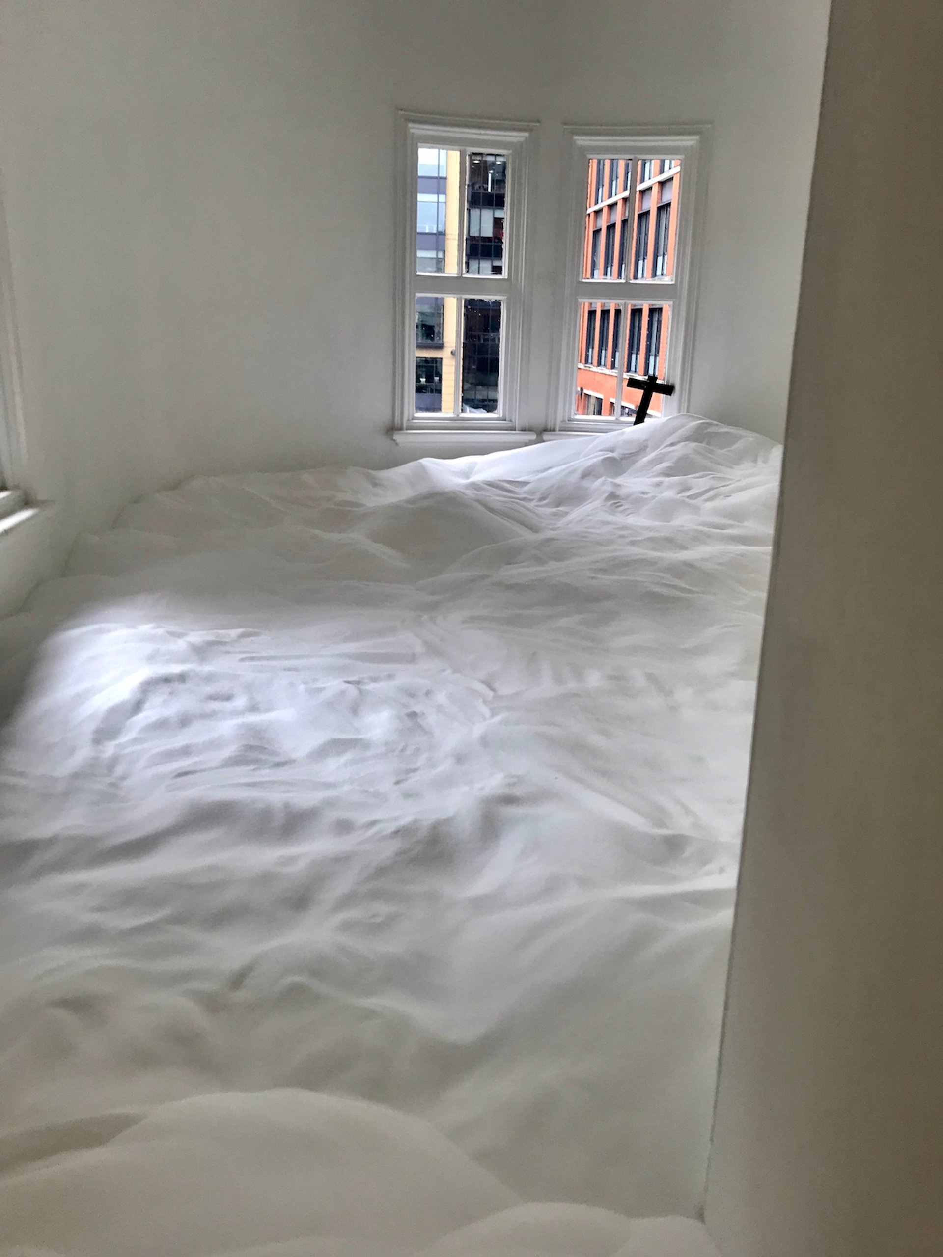 This is a show that is as much about celebration as commemoration and both these aspects come together in one of the most dramatic of exhibits: Linder’s Salt Shrine which fills a small side gallery with several tons of salt. The work was initially made for Stanley’s first officially curated show in his old school building in Widnes in 1997. So enticing was its dune-like expanse of billowing white that, on the opening day and with Linder’s blessing, two of Stanley’s children clambered onto the surface and jumped around, christening both the work and the exhibition in a way that their most gregarious and welcoming father would have undoubtedly approved of.