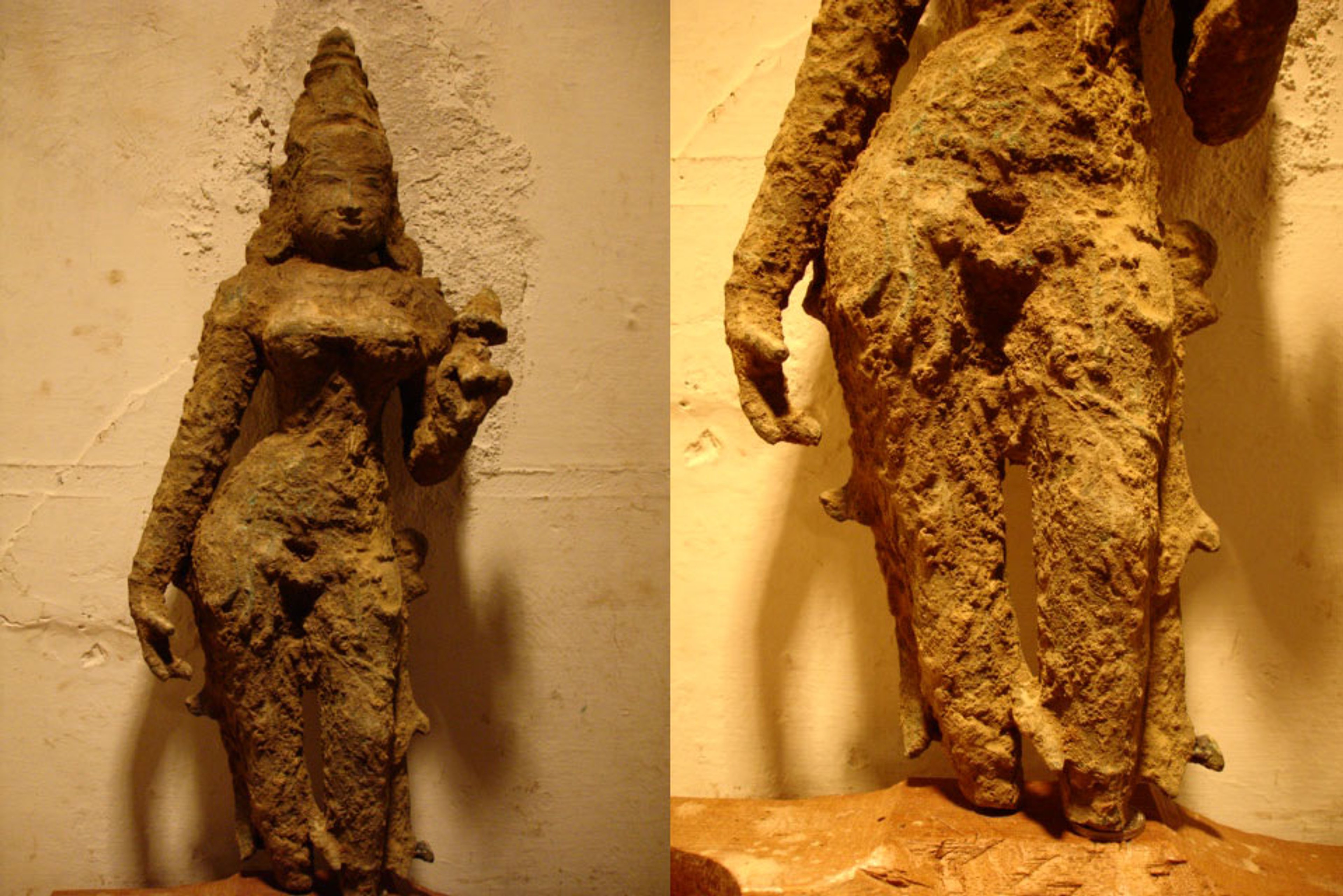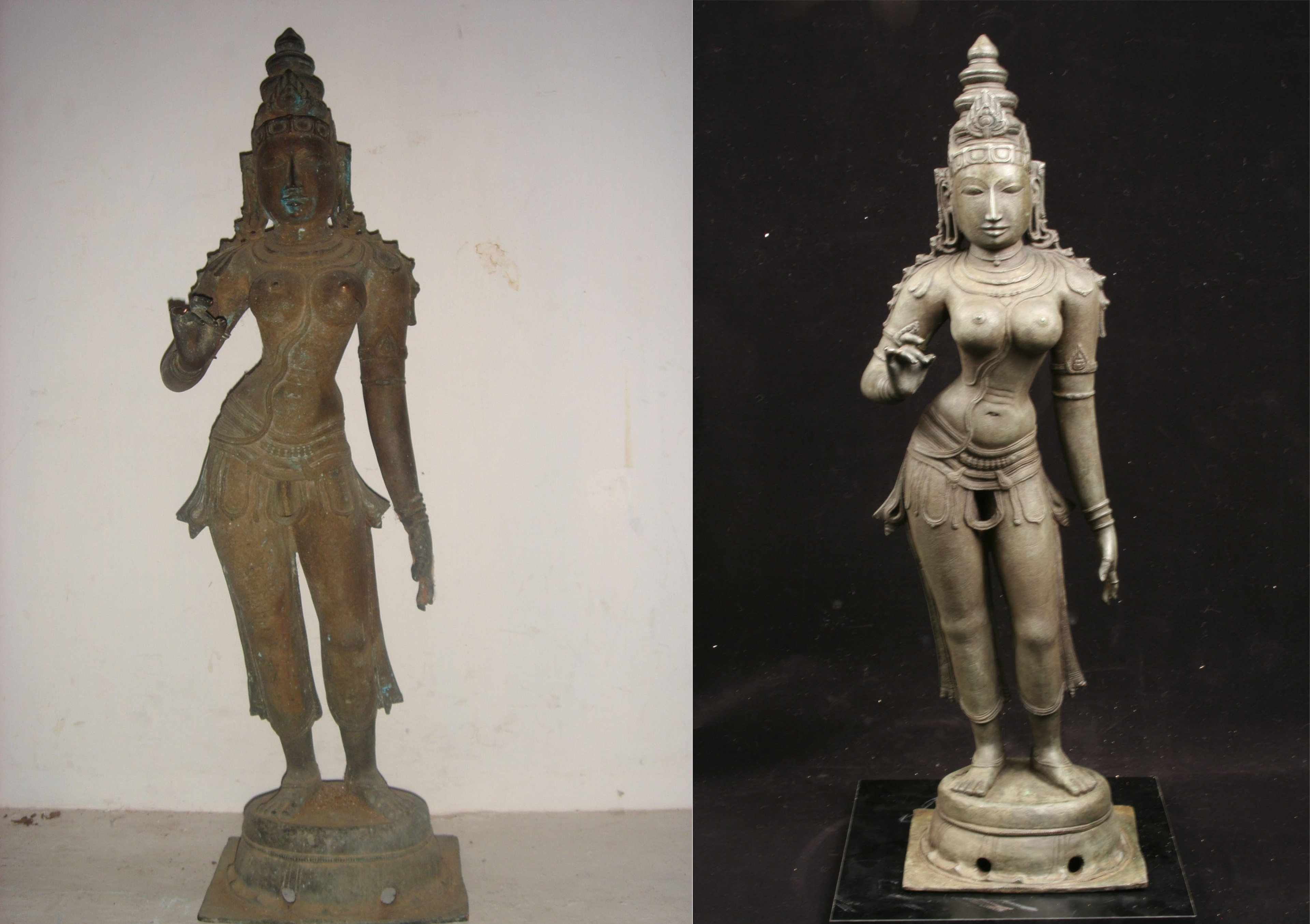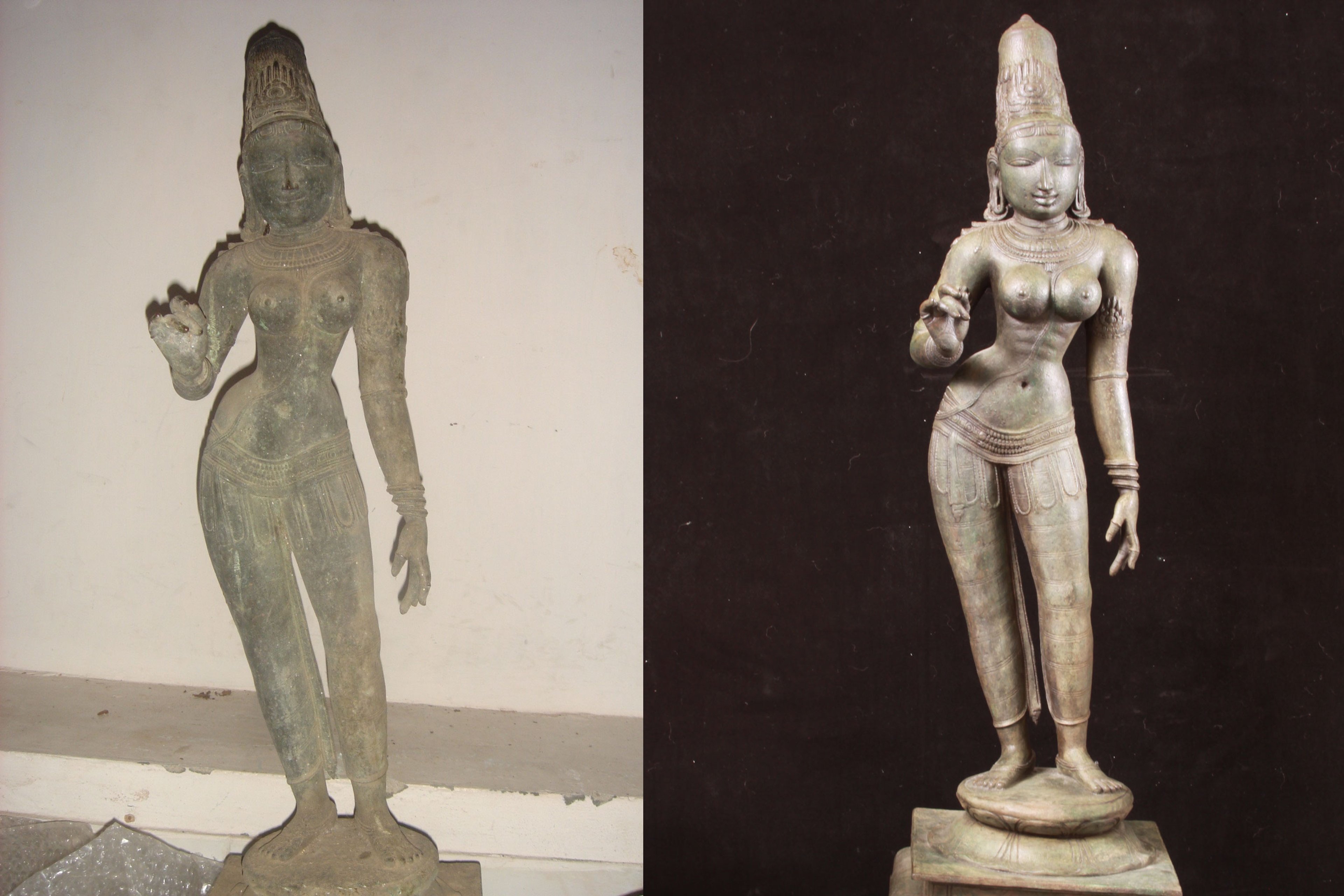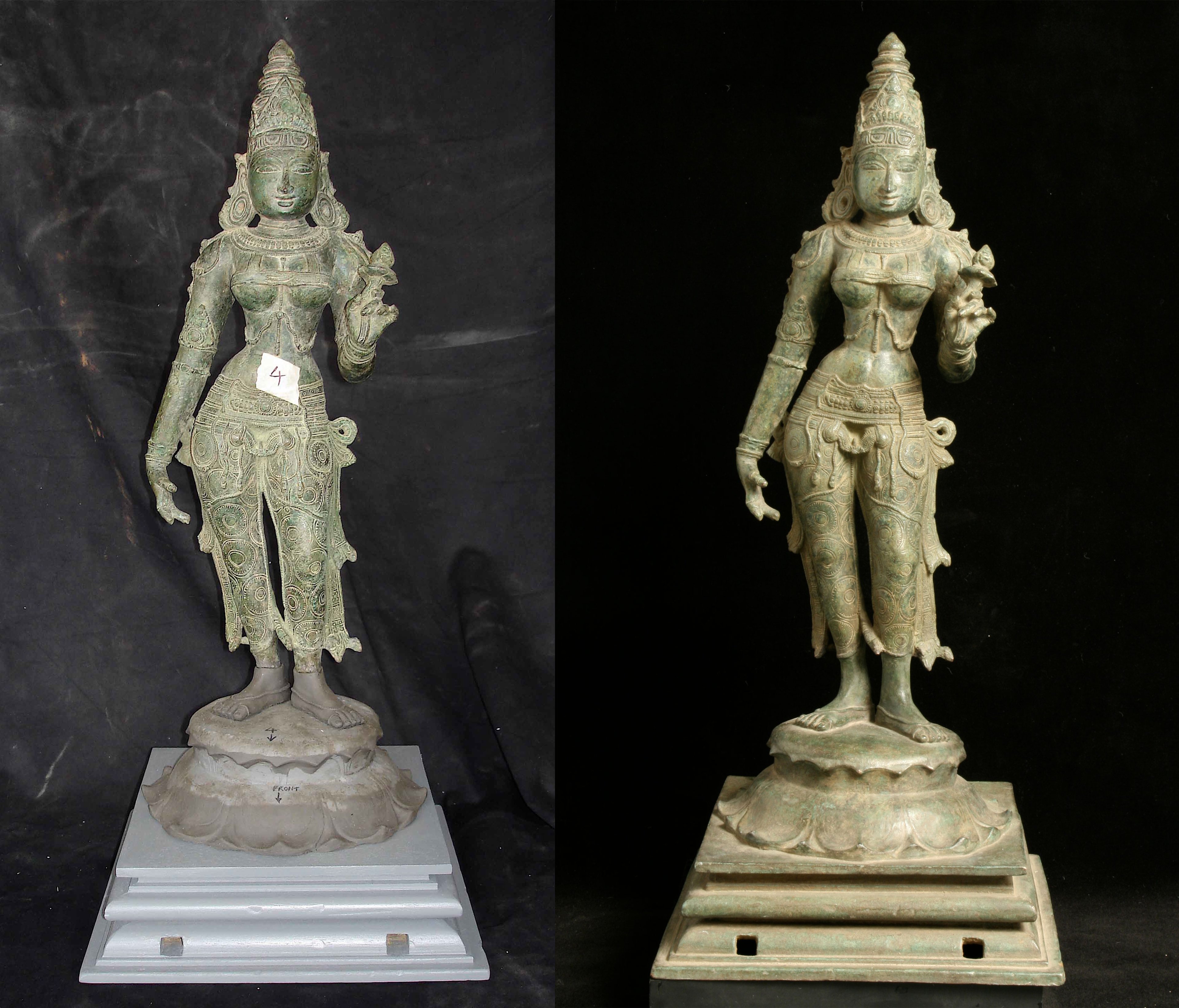 A copper alloy statue of Shivagami Amman, South India, Tamil Nadu, India, Late Chola Period, 13th century, 26in high, pre- and post-restoration. Valued at $1,750,000.