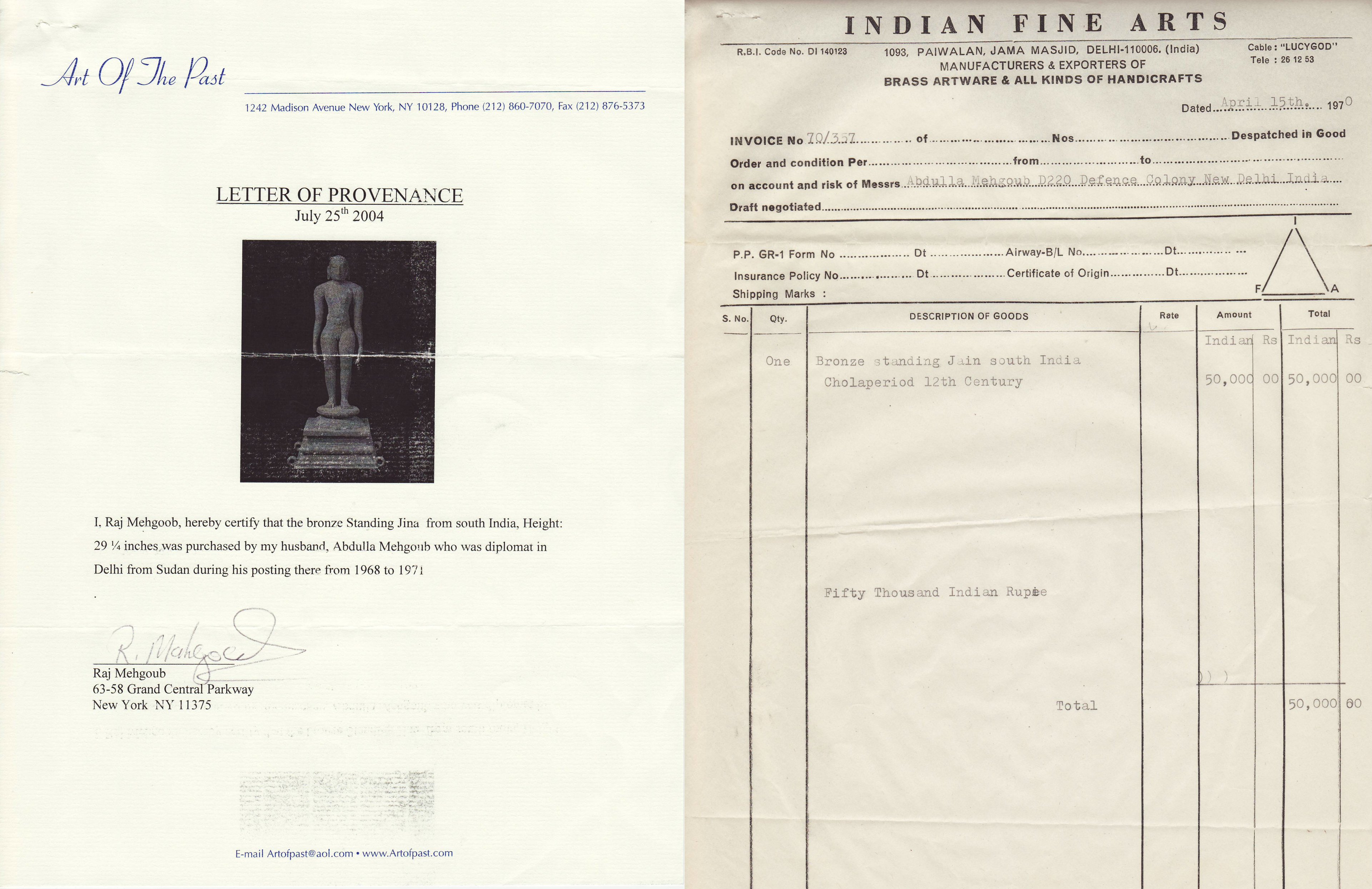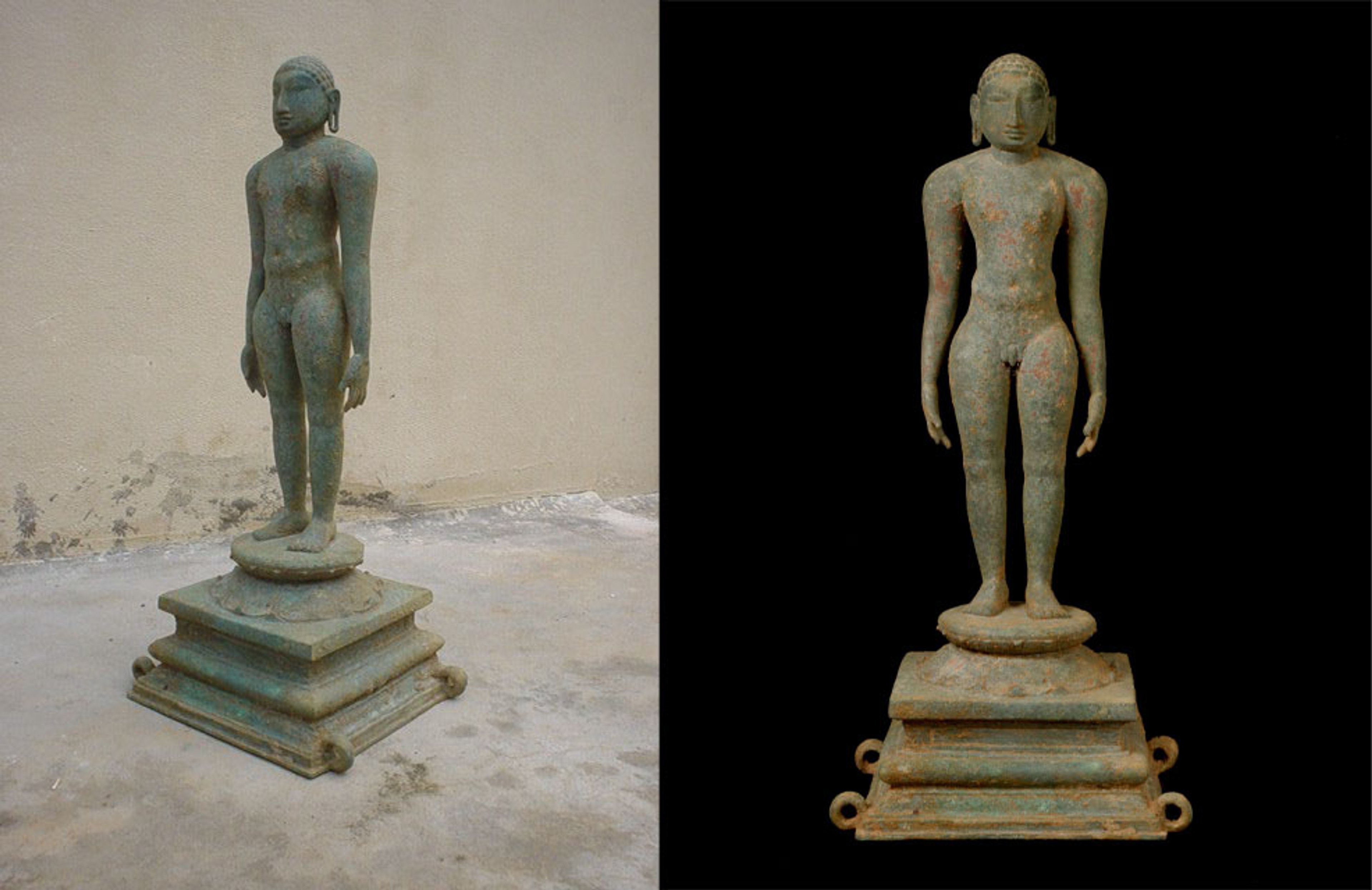 A bronze Standing Jina, from Tamil Nadu, India, Chola period, 12th Century, 29 1 /4 in high. Valued at $750,000.00. The first photo shows the Standing Jina outdoors, "its surface is corroded and covered in loose dirt as if it had only just been dug out of the ground", the government's complaint reads. A 2004 email recovered from one of Kapoor's computers described the work's discovery when a local dug a pond to raise fresh water fishes, and its trail "through four or five hands", to an associate of Kapoor's who has been arrested for his connection to temple thefts. According to authorities, "any antiquity exported without the knowledge and authorization of the Republic of India would be exported illegally". The second photo shows the work post-restoration. It was sold to an unnamed private collector in 2005 for "an undervalued purchase price to avoid taxes", according to authorities.