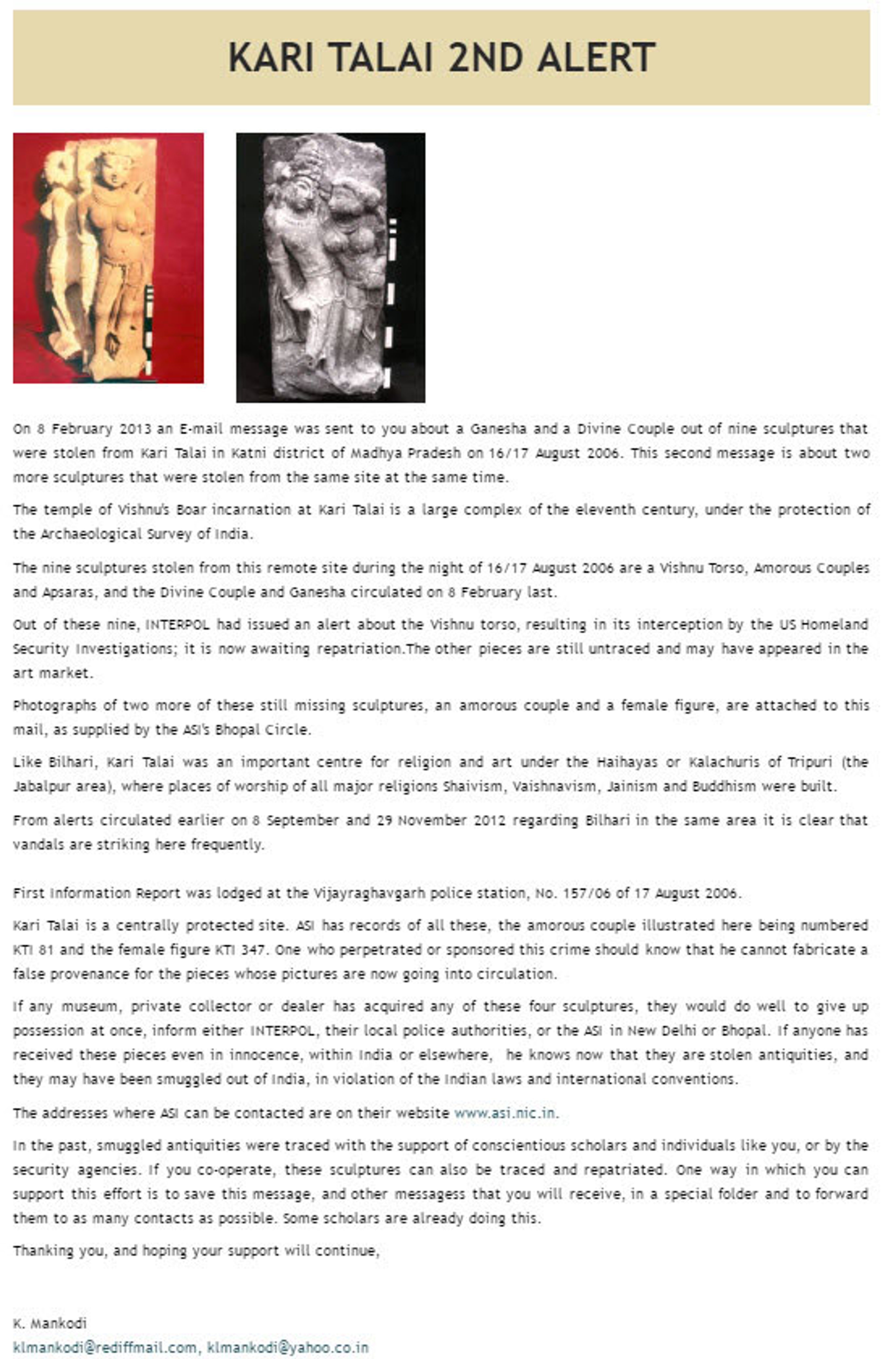 In 2006, nine antiquities stolen were stolen from the Vishnu Varaha Temple in Kari Talai, Madhya Pradesh, India. The ASI photographed the Celestial Figure at the Vishnu Varaha Temple in Kari Talai prior to its theft. The work was consigned to another dealer in Singapore and shipped through Hong Kong.