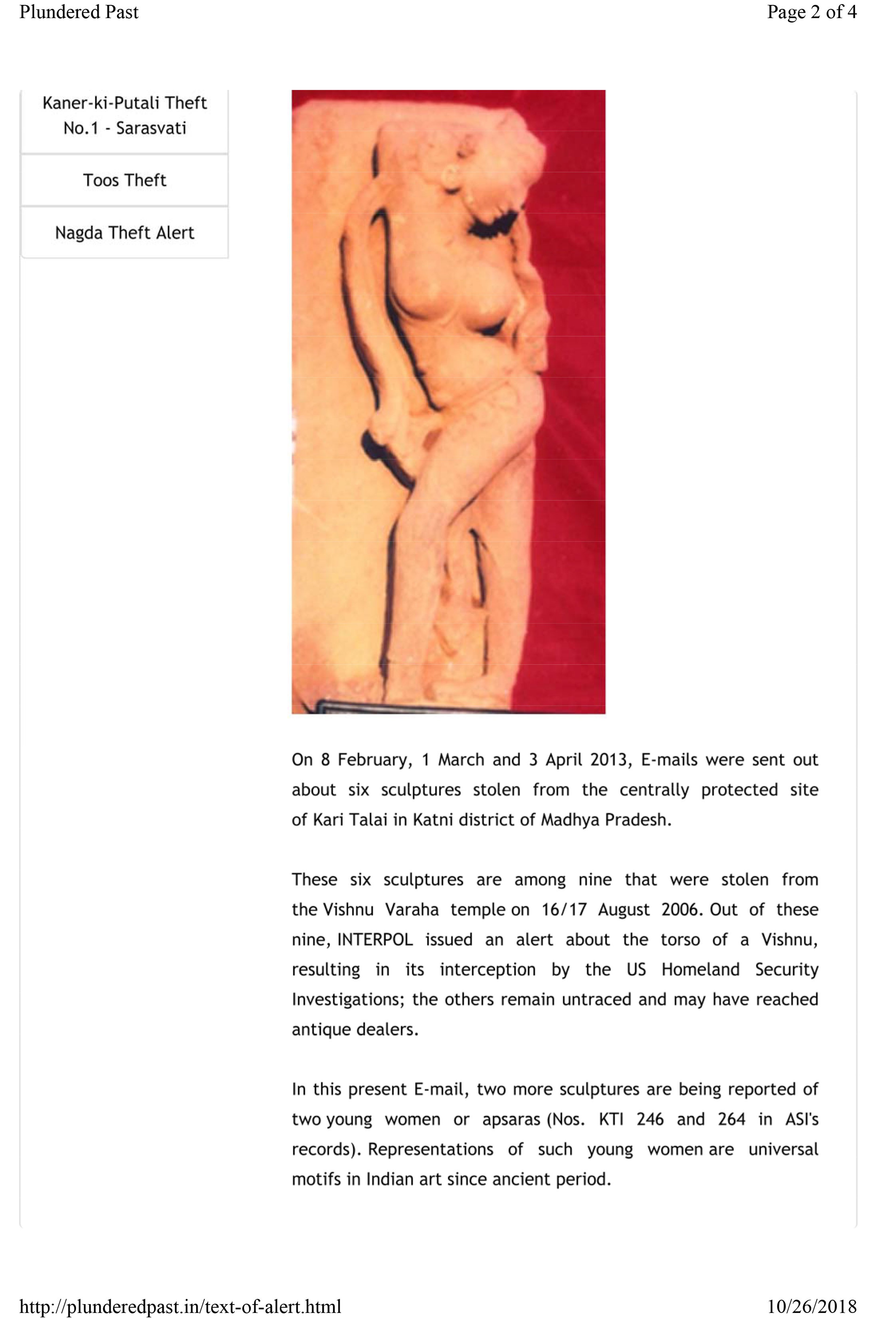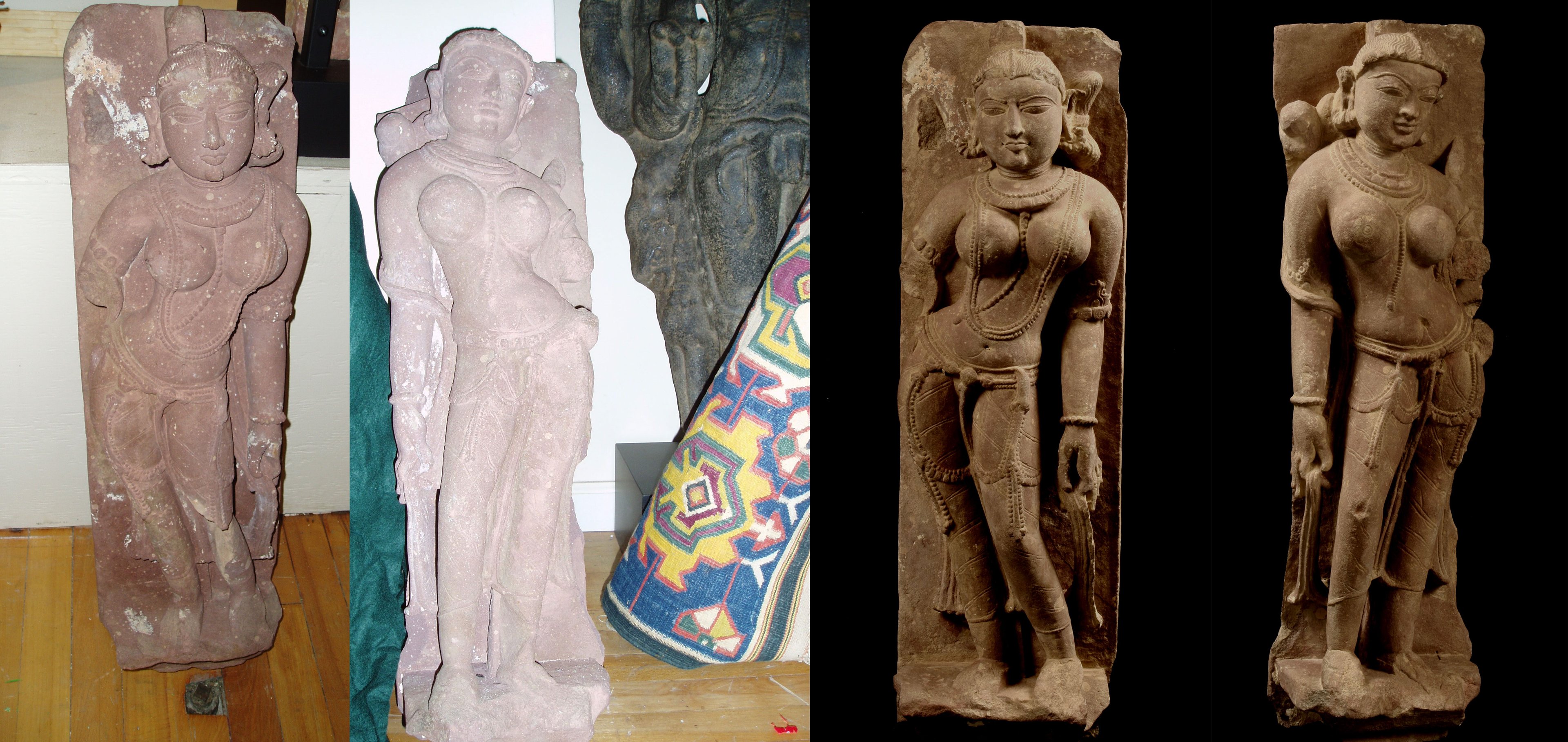 In 2006, nine antiquities stolen were stolen from the Vishnu Varaha Temple in Kari Talai, Madhya Pradesh, India, including a pair of asparas. Prior to their theft, the Archaeological Survey of Indian photographed the works, which were originally attached, and assigned them inventory numbers. The website Plundered Past published the photo and discussed the thefts in a post in 2013. DHS-HSI and DANY photographed the Pair of Apsaras at Sofia Storage, unit 733, in July 2012, but they had not yet been identified as stolen and were not seized.