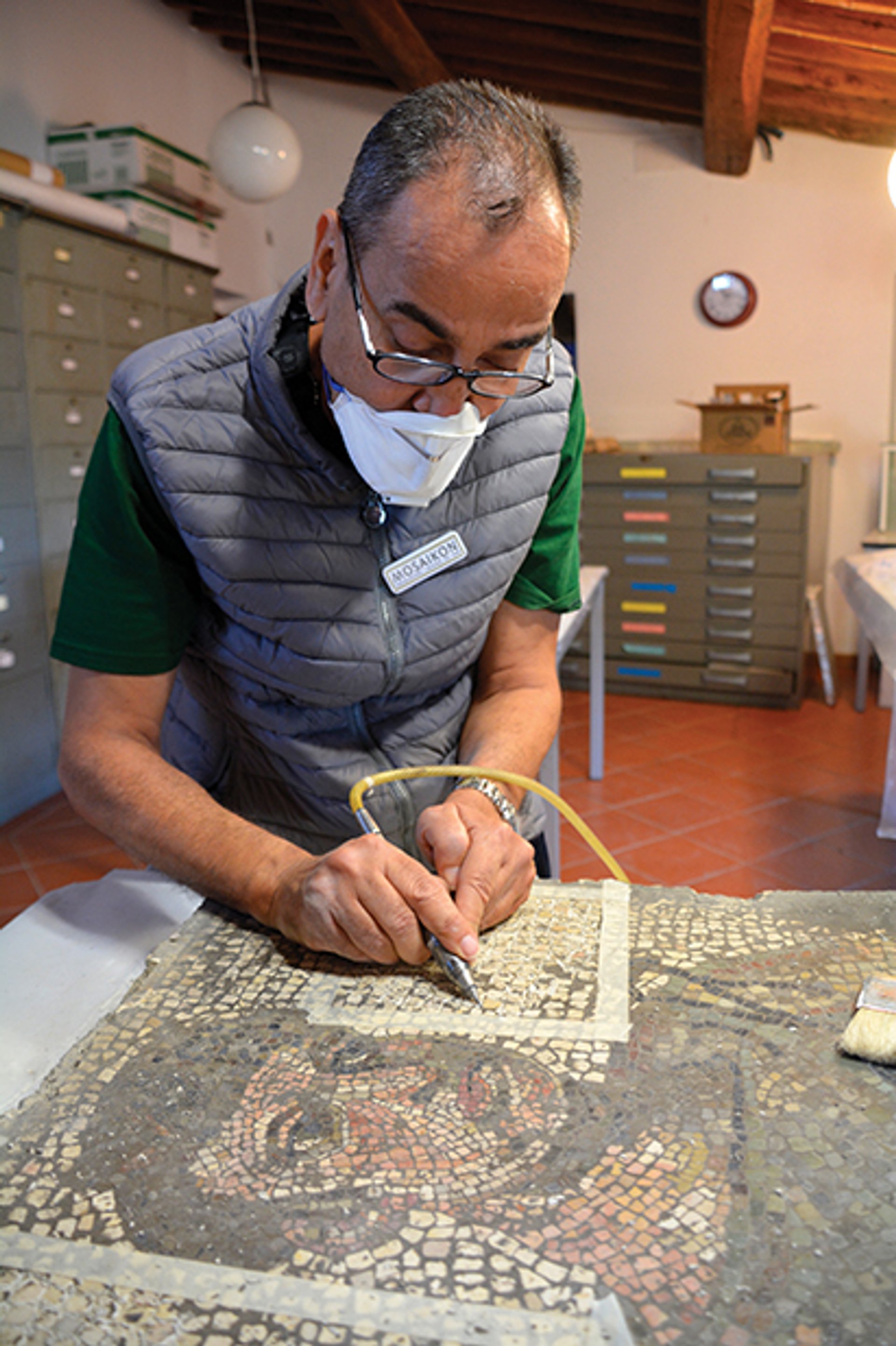 Thomas Roby, a senior project specialist for the GCI who has led months-long training sessions of budding technicians throughout the region, says that a recent conservation strategy is to painstakingly remove the reinforced concrete backing and then lay the mosaic on a new lime mortar bedding imitating the original Roman mortar layers.