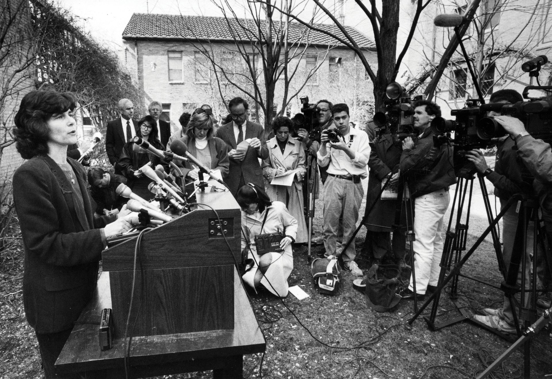 Anne Hawley, the director of the Isabella Stewart Gardner Museum in Boston at the time, answers questions at a news conference in the garden after the 1990 robbery Photo by Tom Landers/The Boston Globe via Getty Images
