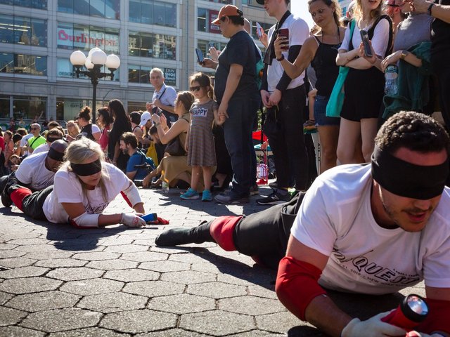 The performance, titled Conquest, brings the ideas of social privilege and political advantage into a physical and symbolic struggle. Participants will crawl with props, including a blindfold and flashlight according to a release, and will be asked to crawl with one shoe. Pope.L, who has staged many similar grueling journeys during his career, will walk alongside the performers, giving support as needed. “Working at the margins of the mainstream art world for decades, Pope.L has created a profound and compelling body of work unlike that of any of his contemporaries,” says Nicholas Baume, the Public Art Fund’s director and chief curator, in a statement. “As an epic group undertaking, Conquest promises to extend the richly layered metaphors around race, power and vulnerability in his solo crawls to further explore diversity, collectivity, struggle and achievement.”